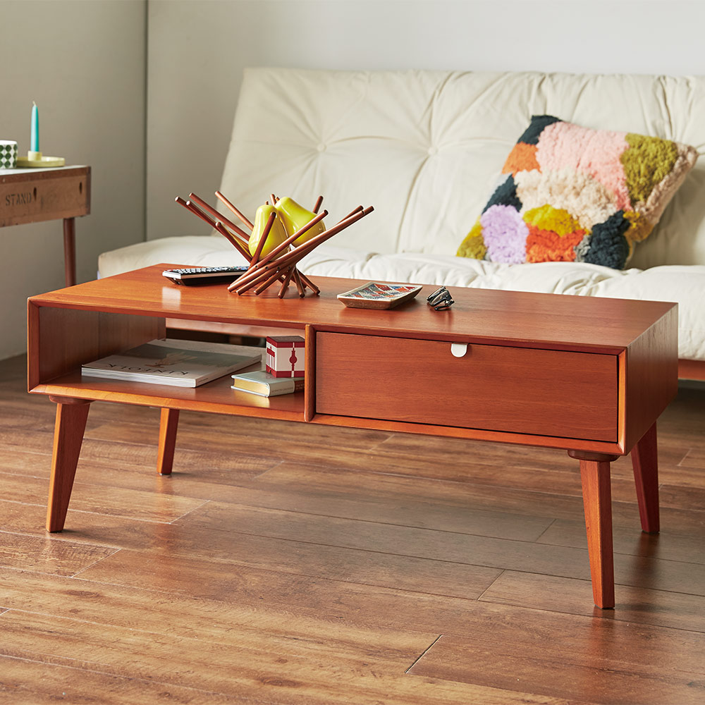 前後どちらからも開閉できる、便利な引き出し付きのローテーブル・センターテーブル
