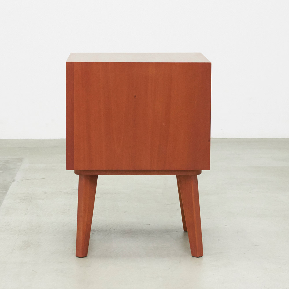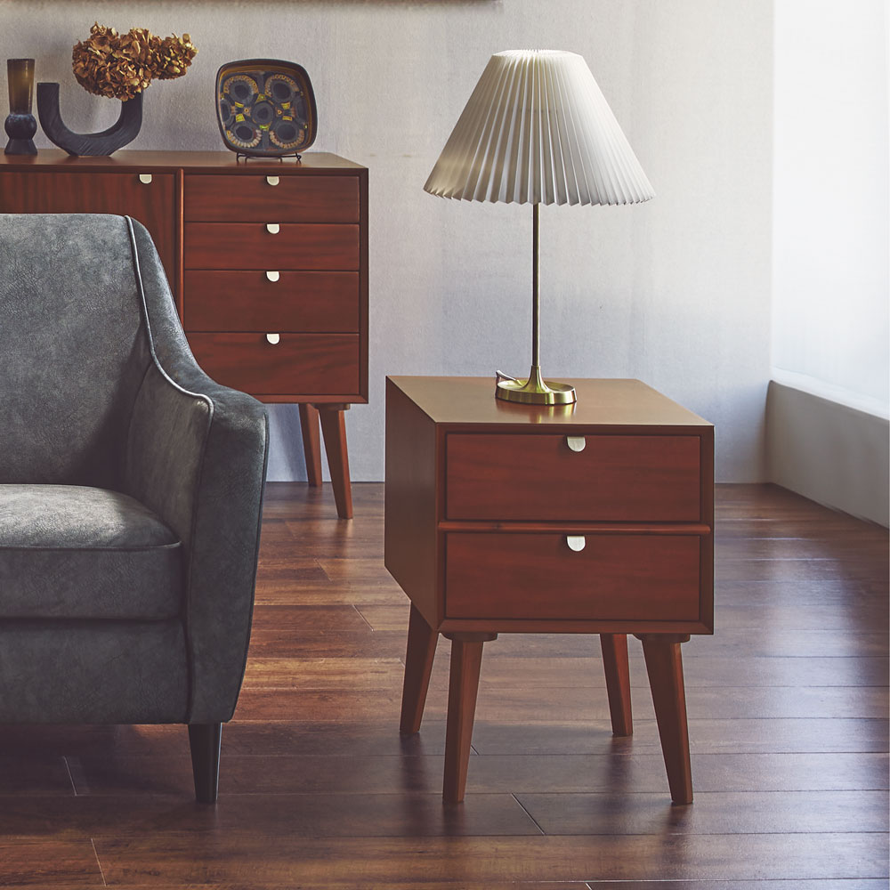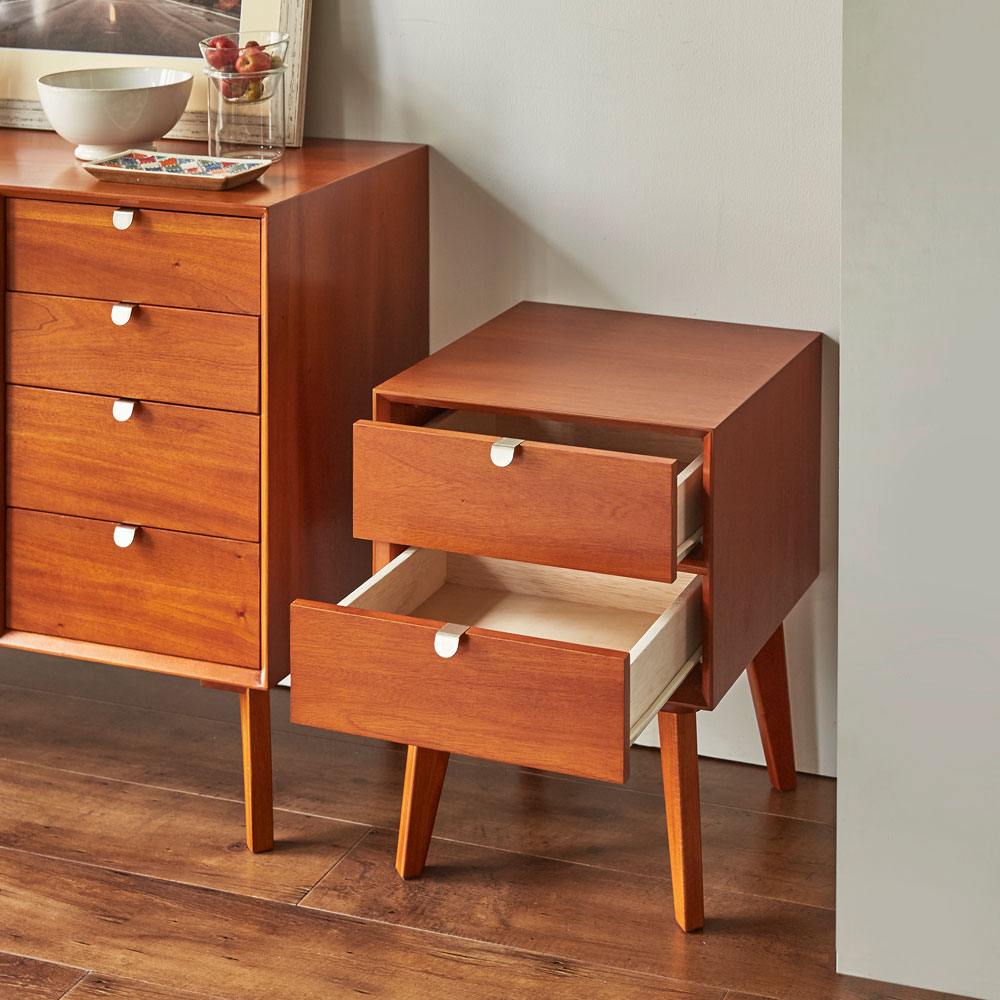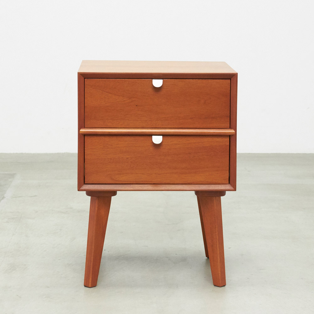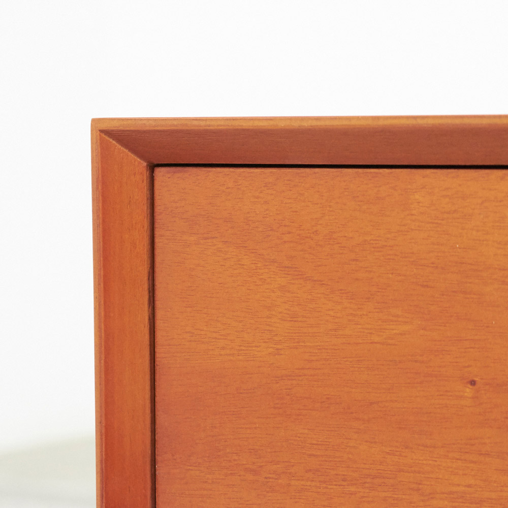 1950年代頃のデンマークによく見られる、長い脚のついた家具のスタイルをリアルに再現したシリーズ。この頃のものにみられる赤みのある色合いも丁寧に表現しました。角の仕上げから、真鍮の取っ手まで、本物のビンテージのようなインテリア空間を気軽にお楽しみいただけます。マホガニーの木目が美しいたっぷり収納のミニチェスト・サイドテーブル