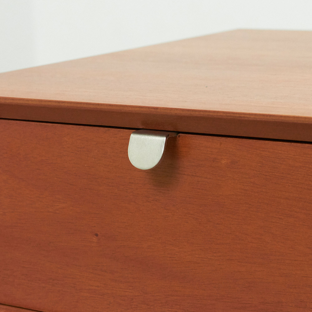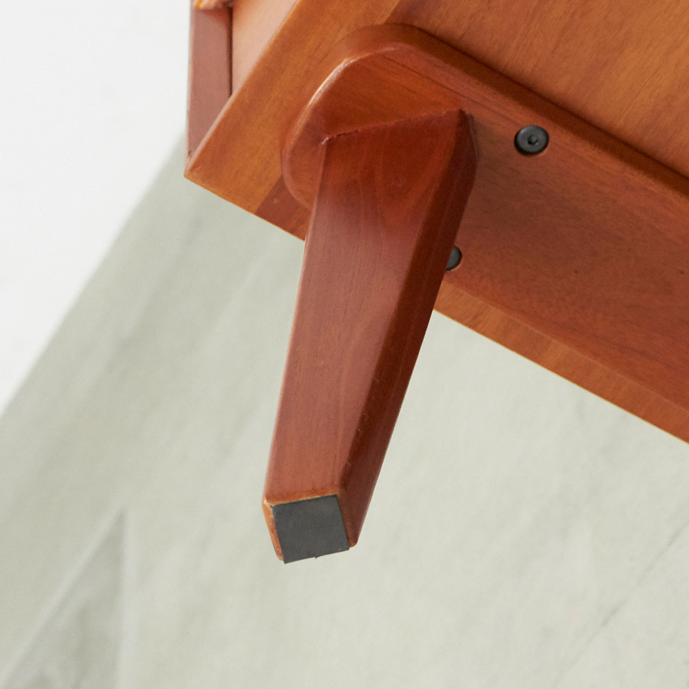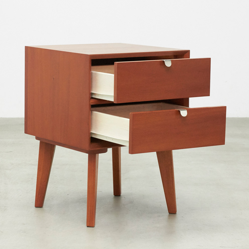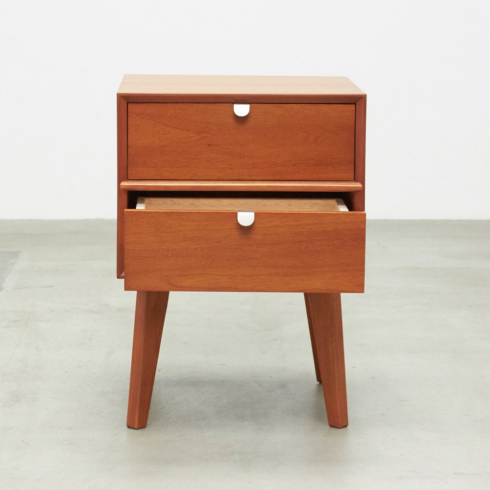 1950年代頃のデンマークによく見られる、長い脚のついた家具のスタイルをリアルに再現したシリーズ。この頃のものにみられる赤みのある色合いも丁寧に表現しました。角の仕上げから、真鍮の取っ手まで、本物のビンテージのようなインテリア空間を気軽にお楽しみいただけます。マホガニーの木目が美しいたっぷり収納のミニチェスト・サイドテーブル