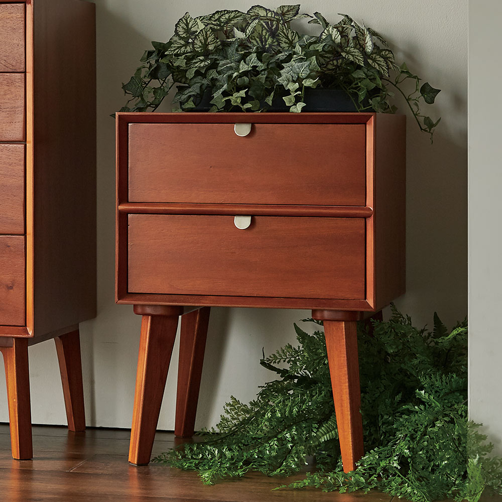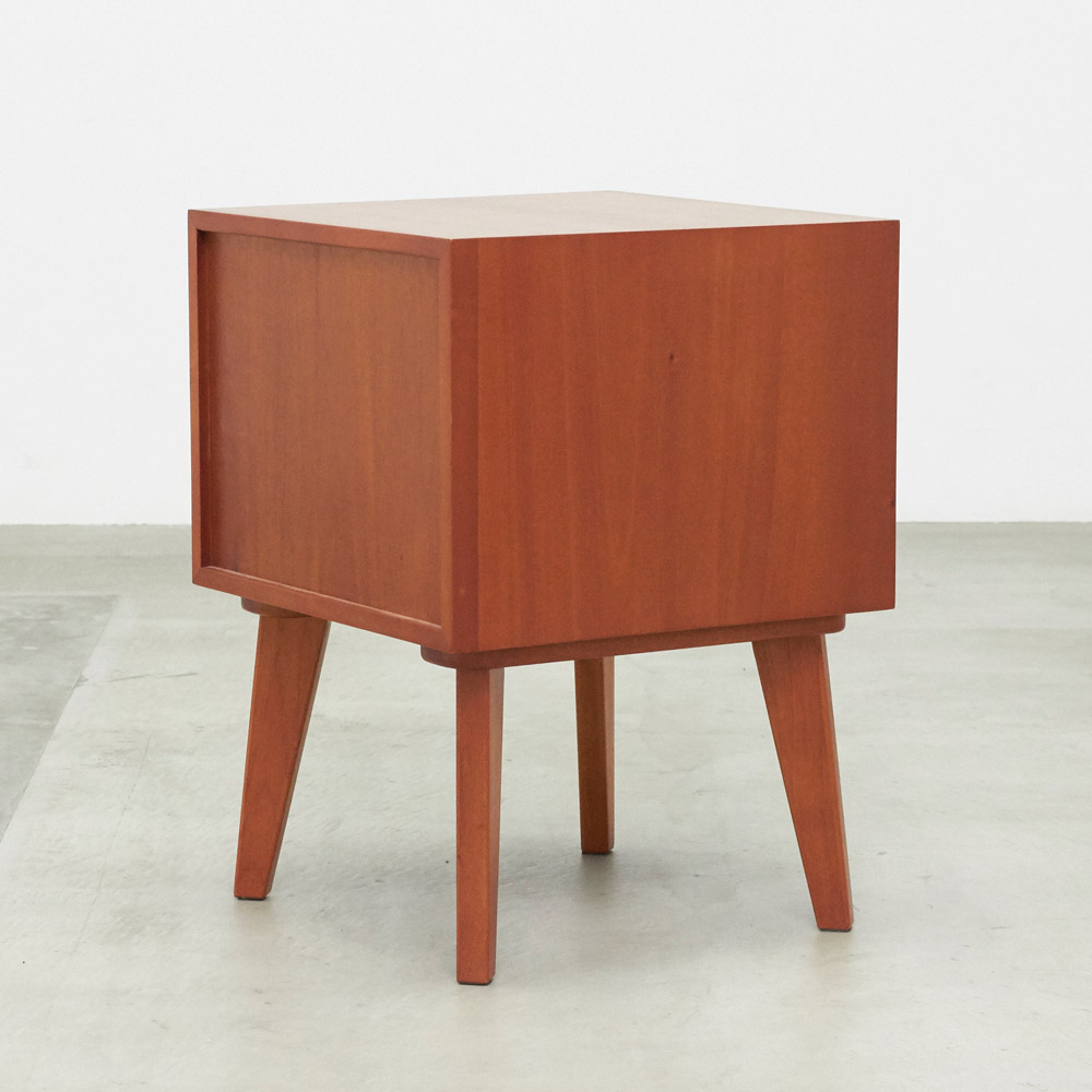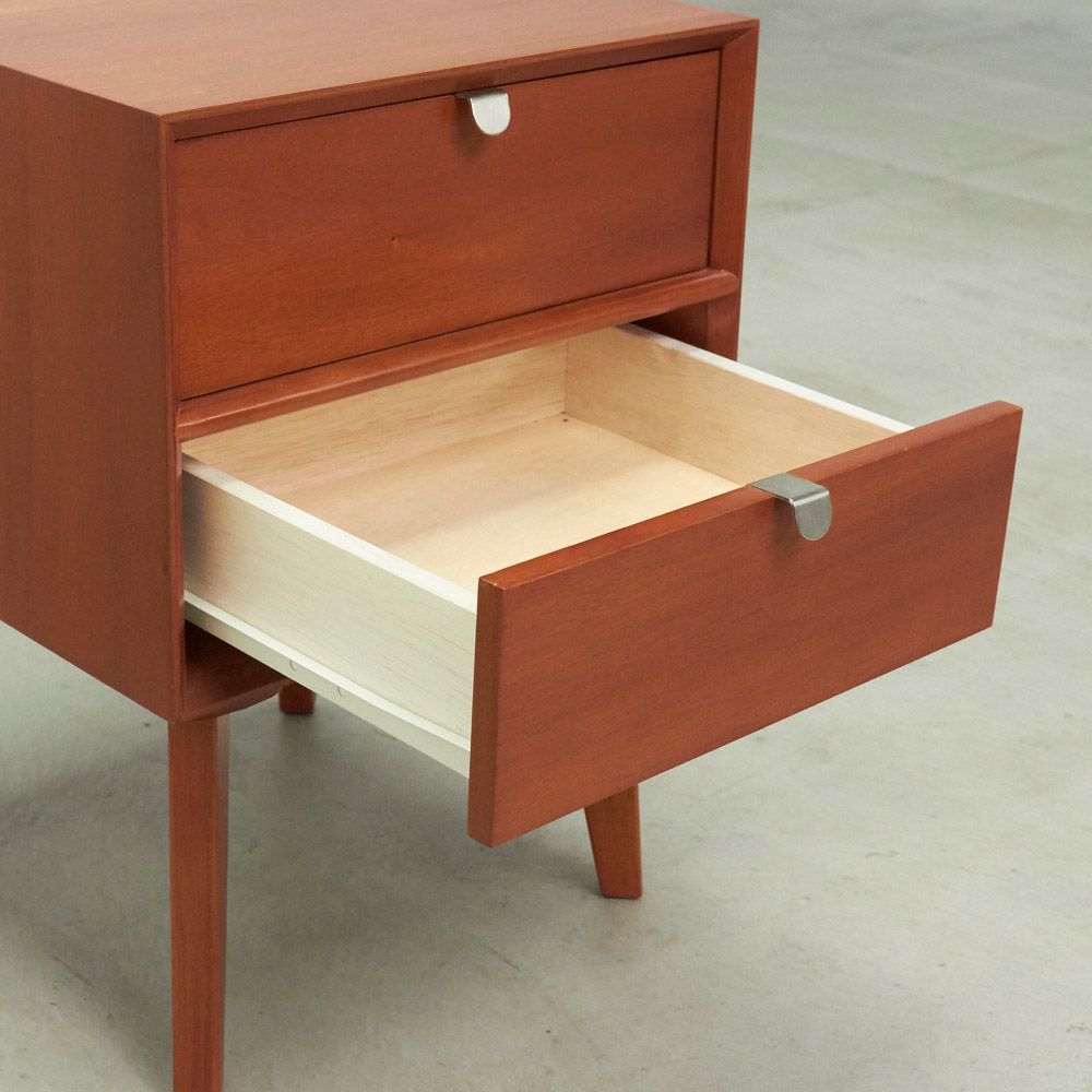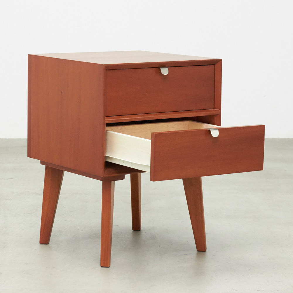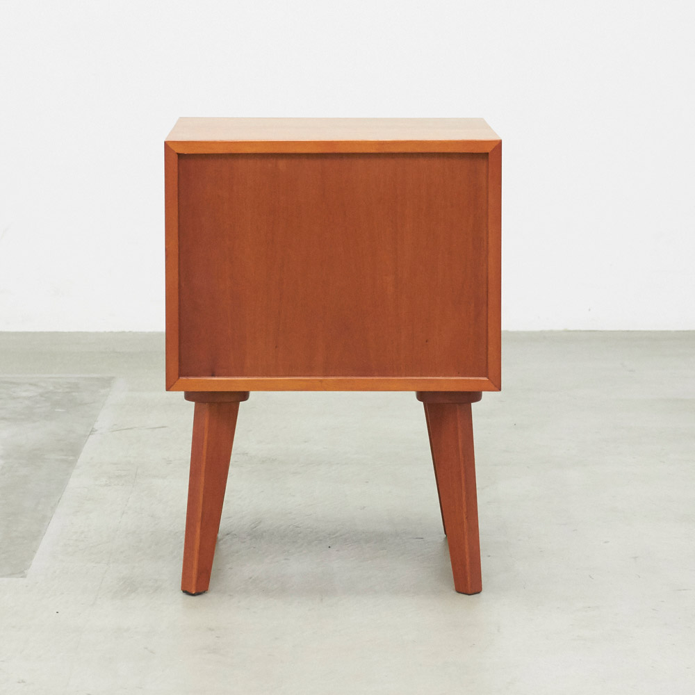 1950年代頃のデンマークによく見られる、長い脚のついた家具のスタイルをリアルに再現したシリーズ。この頃のものにみられる赤みのある色合いも丁寧に表現しました。角の仕上げから、真鍮の取っ手まで、本物のビンテージのようなインテリア空間を気軽にお楽しみいただけます。マホガニーの木目が美しいたっぷり収納のミニチェスト・サイドテーブル