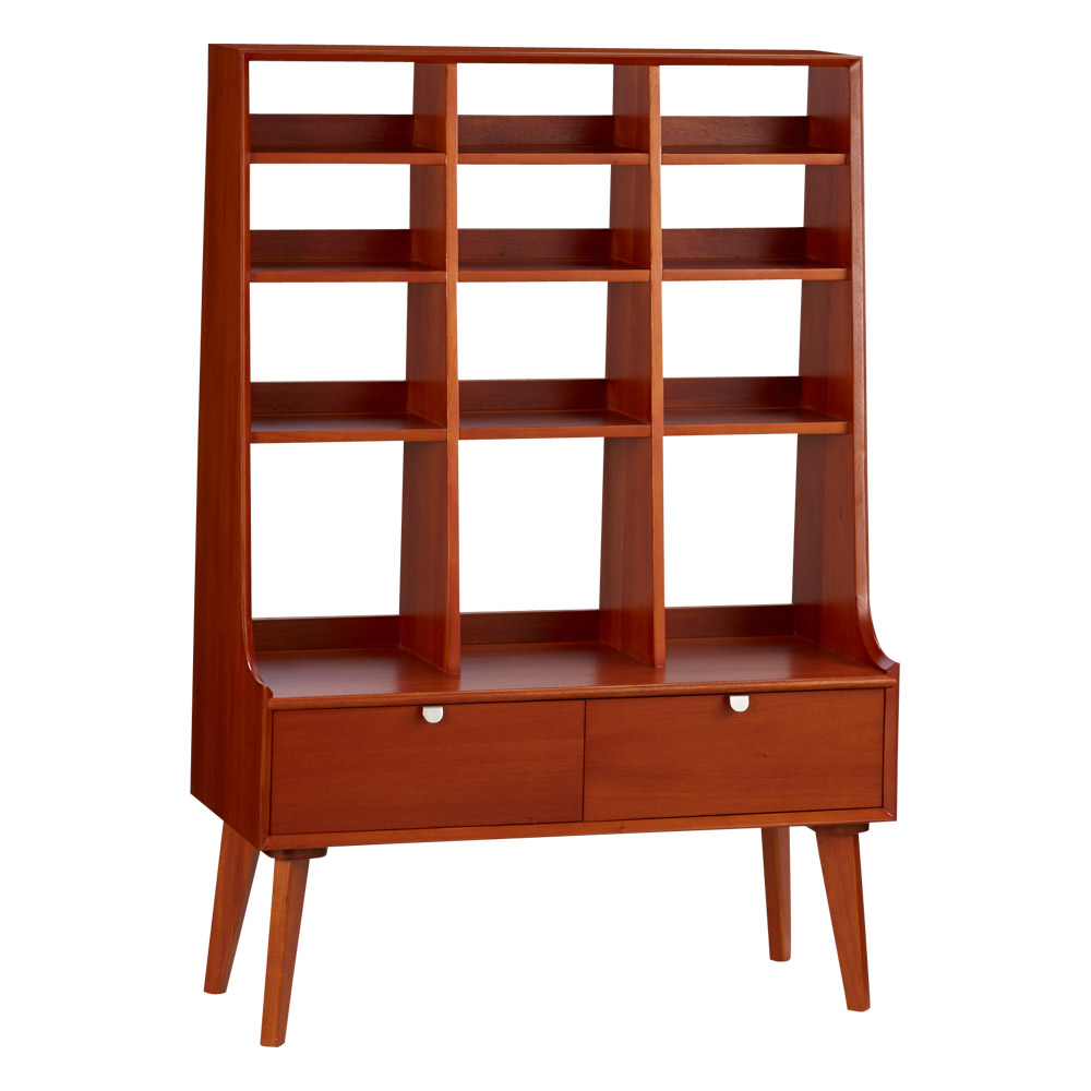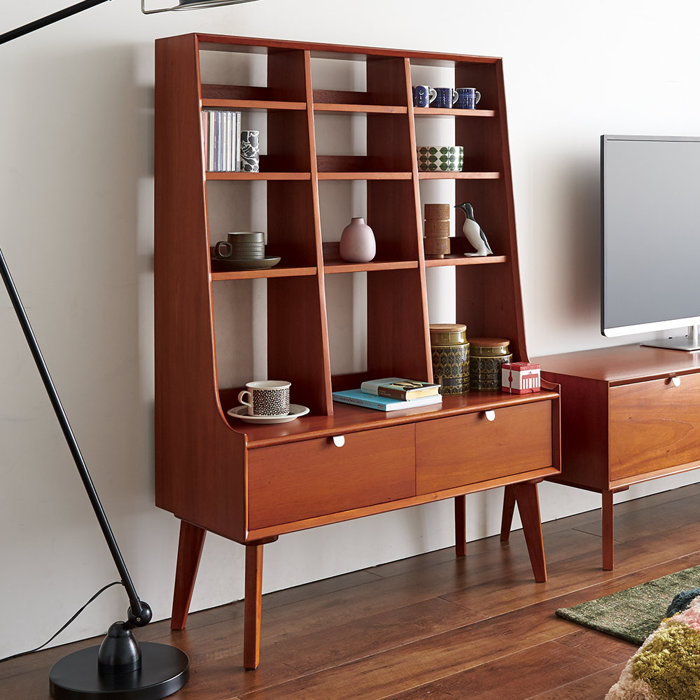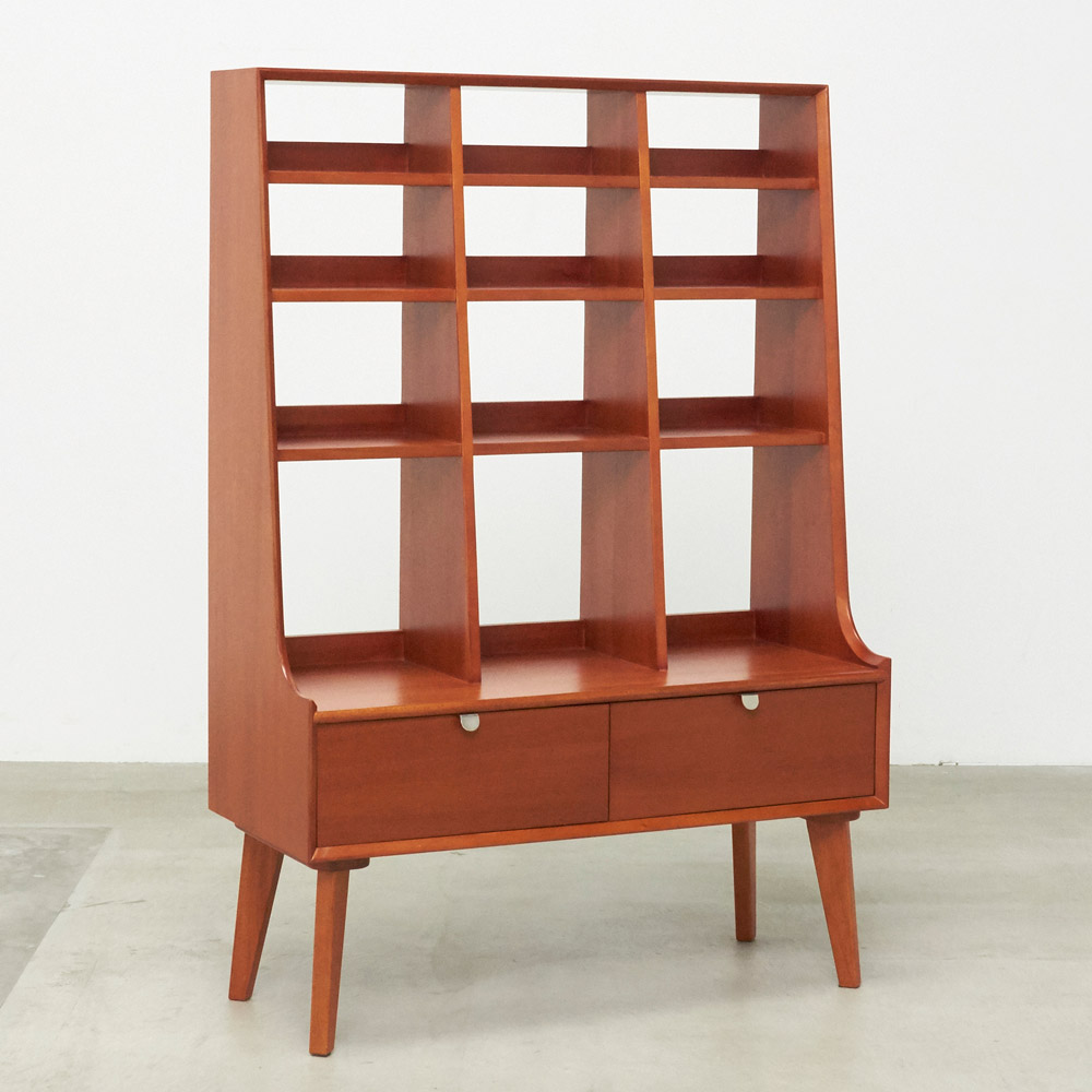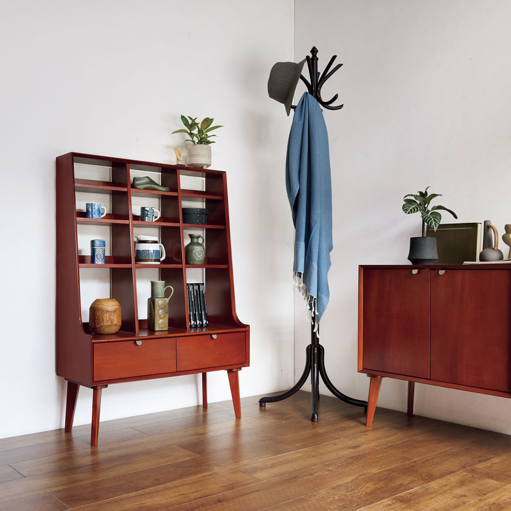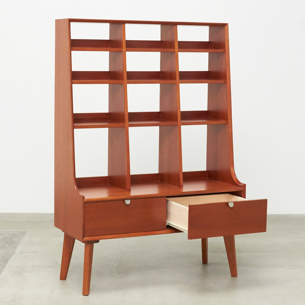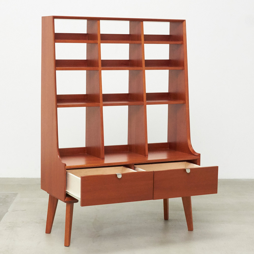 1950年代頃のデンマークによく見られる、長い脚のついた家具のスタイルをリアルに再現したシリーズ。この頃のものにみられる赤みのある色合いも丁寧に表現しました。角の仕上げから、真鍮の取っ手まで、本物のビンテージのようなインテリア空間を気軽にお楽しみいただけます。マホガニーの木目が美しいたっぷり収納の書棚・本棚