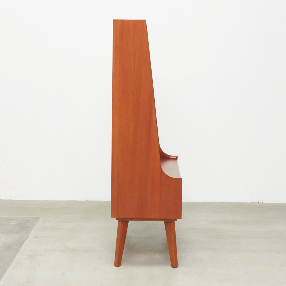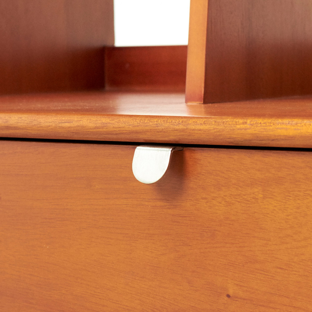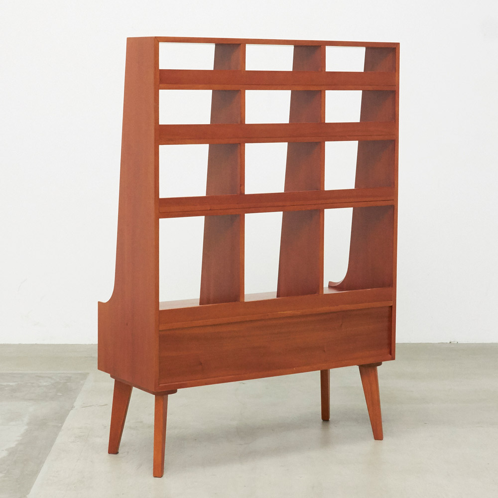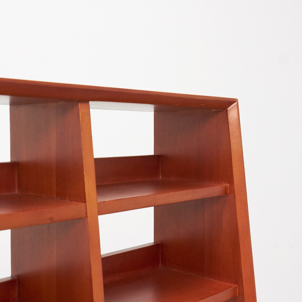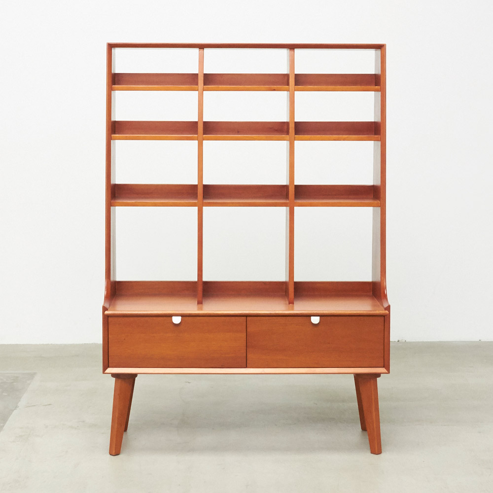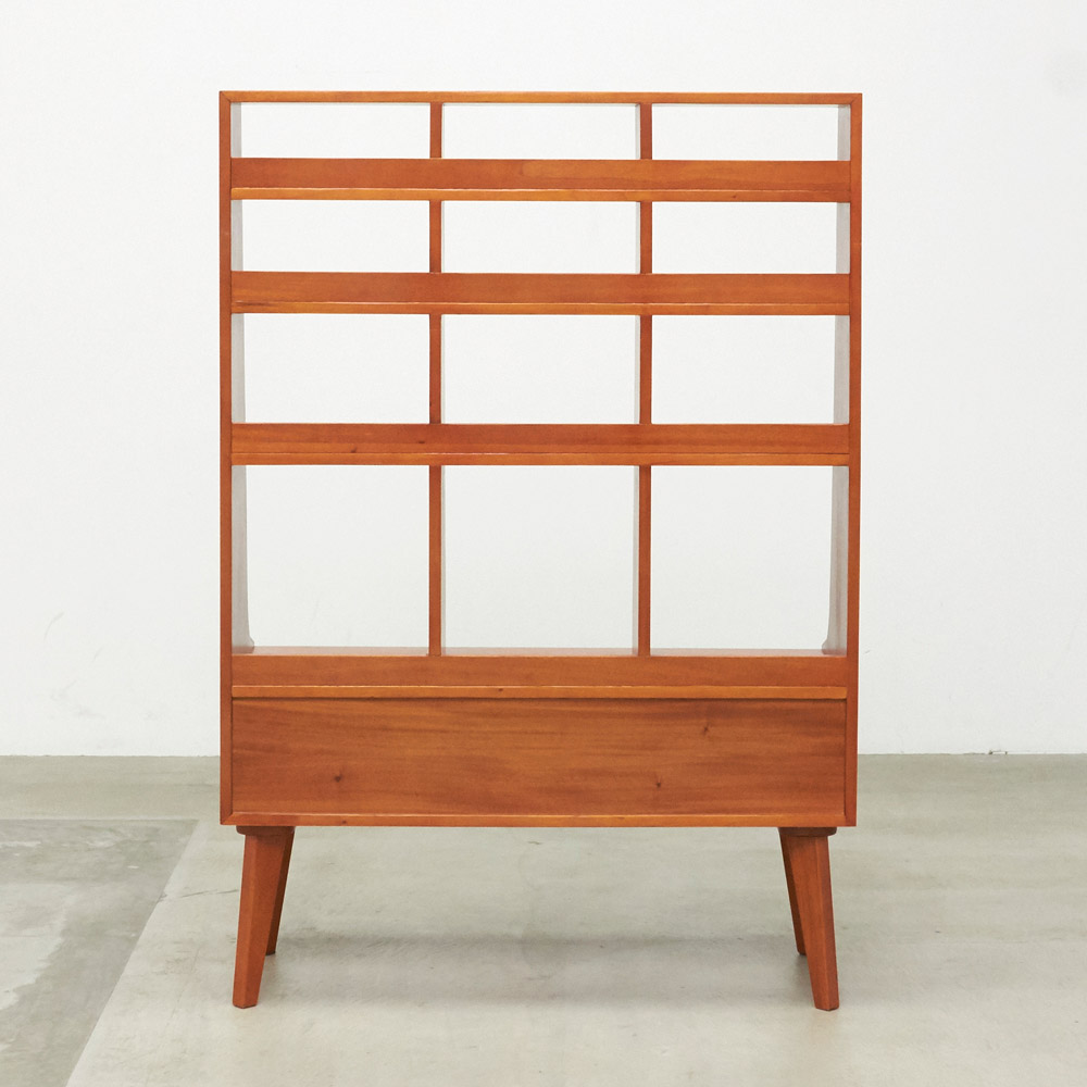 1950年代頃のデンマークによく見られる、長い脚のついた家具のスタイルをリアルに再現したシリーズ。この頃のものにみられる赤みのある色合いも丁寧に表現しました。角の仕上げから、真鍮の取っ手まで、本物のビンテージのようなインテリア空間を気軽にお楽しみいただけます。マホガニーの木目が美しいたっぷり収納の書棚・本棚