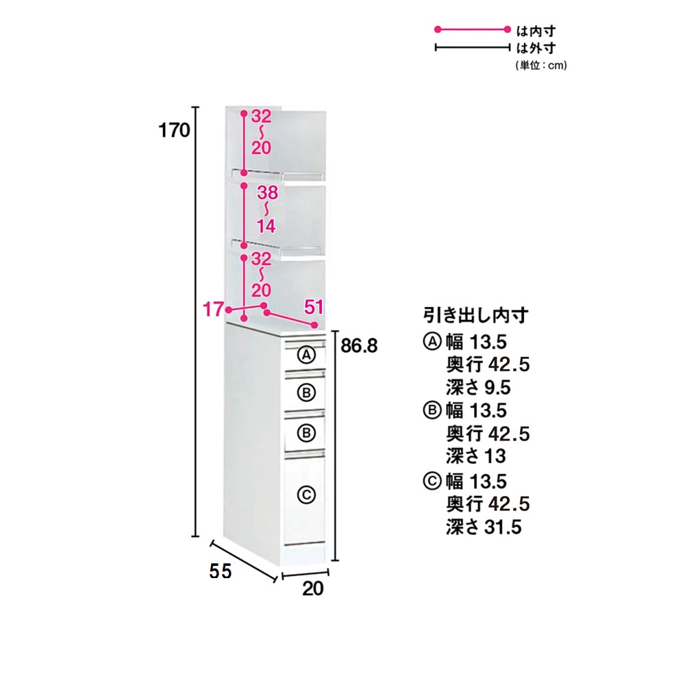 ■サイズ:幅20奥行55高さ170、引き出し奥行42.5、引き出し有効内寸(約:cm)…幅13.5深さ小9.5中13大31.5cm・重量約27kg
