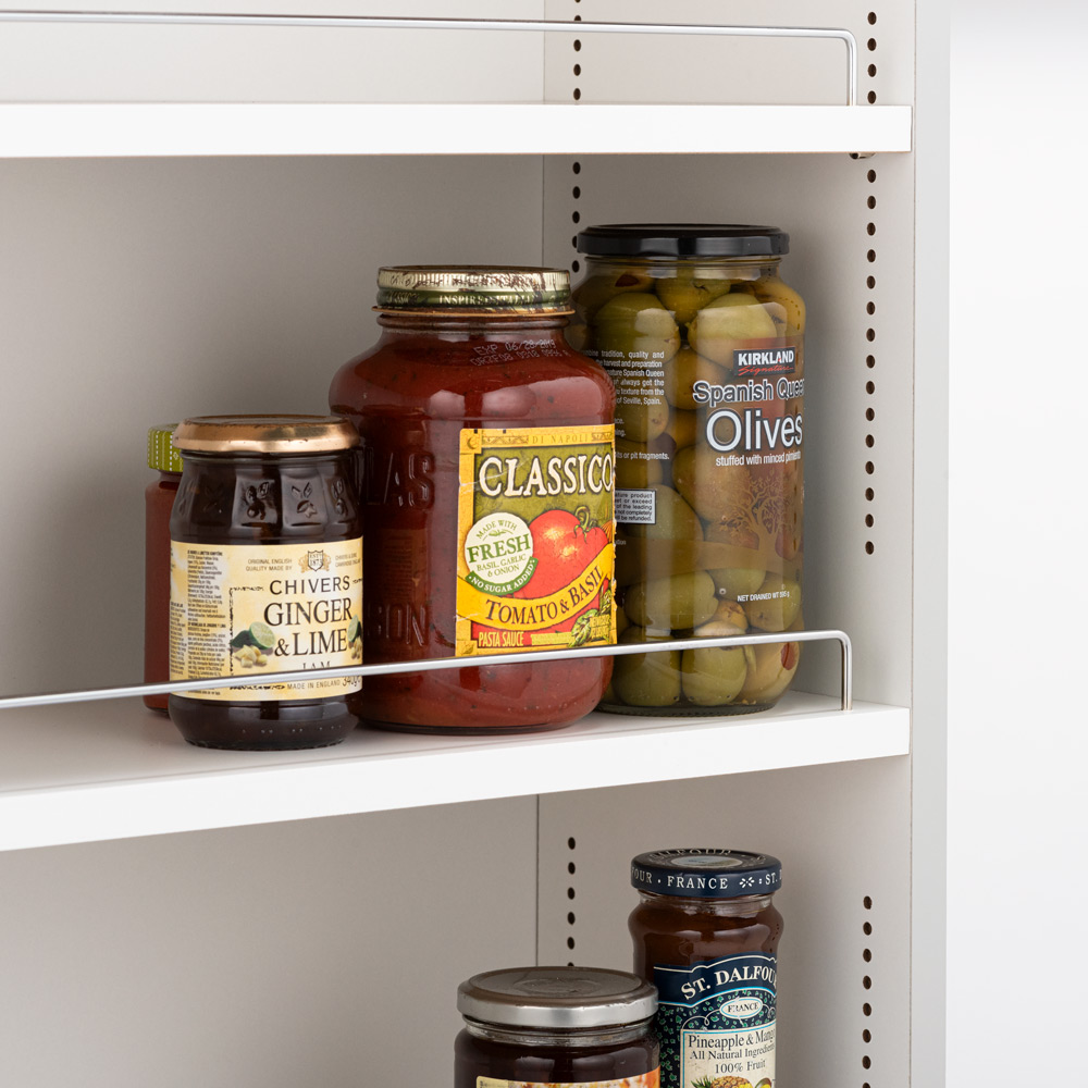 収納物が落ちづらい、こぼれ止めバー付き(最下段を除く)。