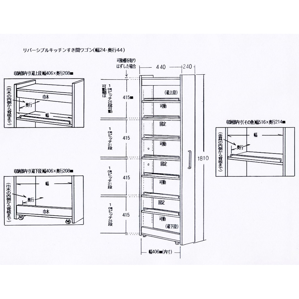 [幅24奥行45cm] リバーシブルキッチンすき間収納ワゴン 日本製 キッチンストッカー 隙間収納 キッチン収納 630037
