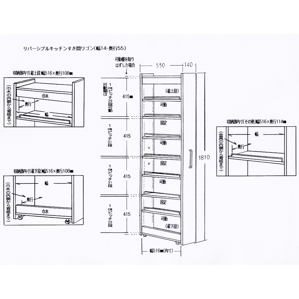 [幅14奥行55cm] リバーシブルキッチンすき間収納ワゴン 日本製 キッチンストッカー 隙間収納 キッチン収納 630040