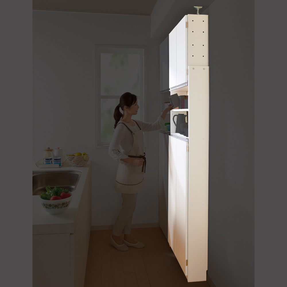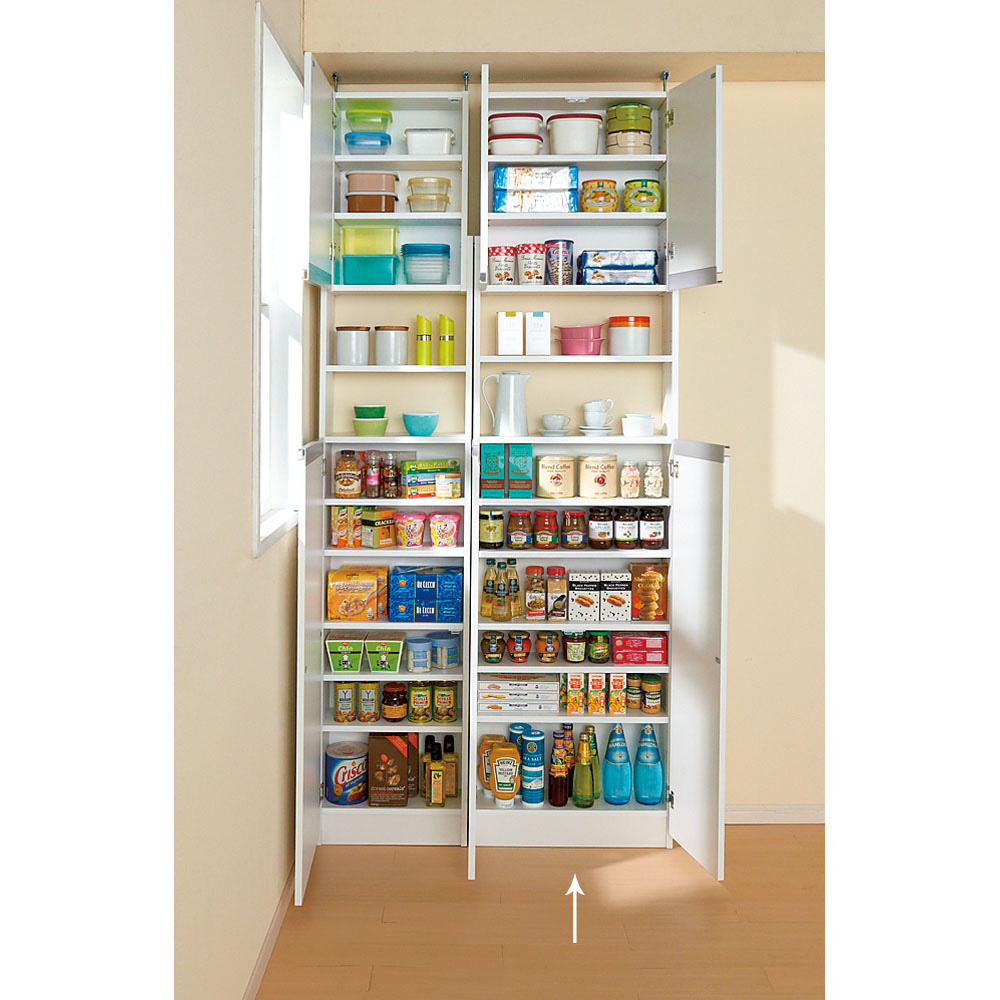 ◆場所をとらない薄型ながら食品や飲料ストック、調味料、食器類などを最大限効率よく収納できるサイズ設計です。
