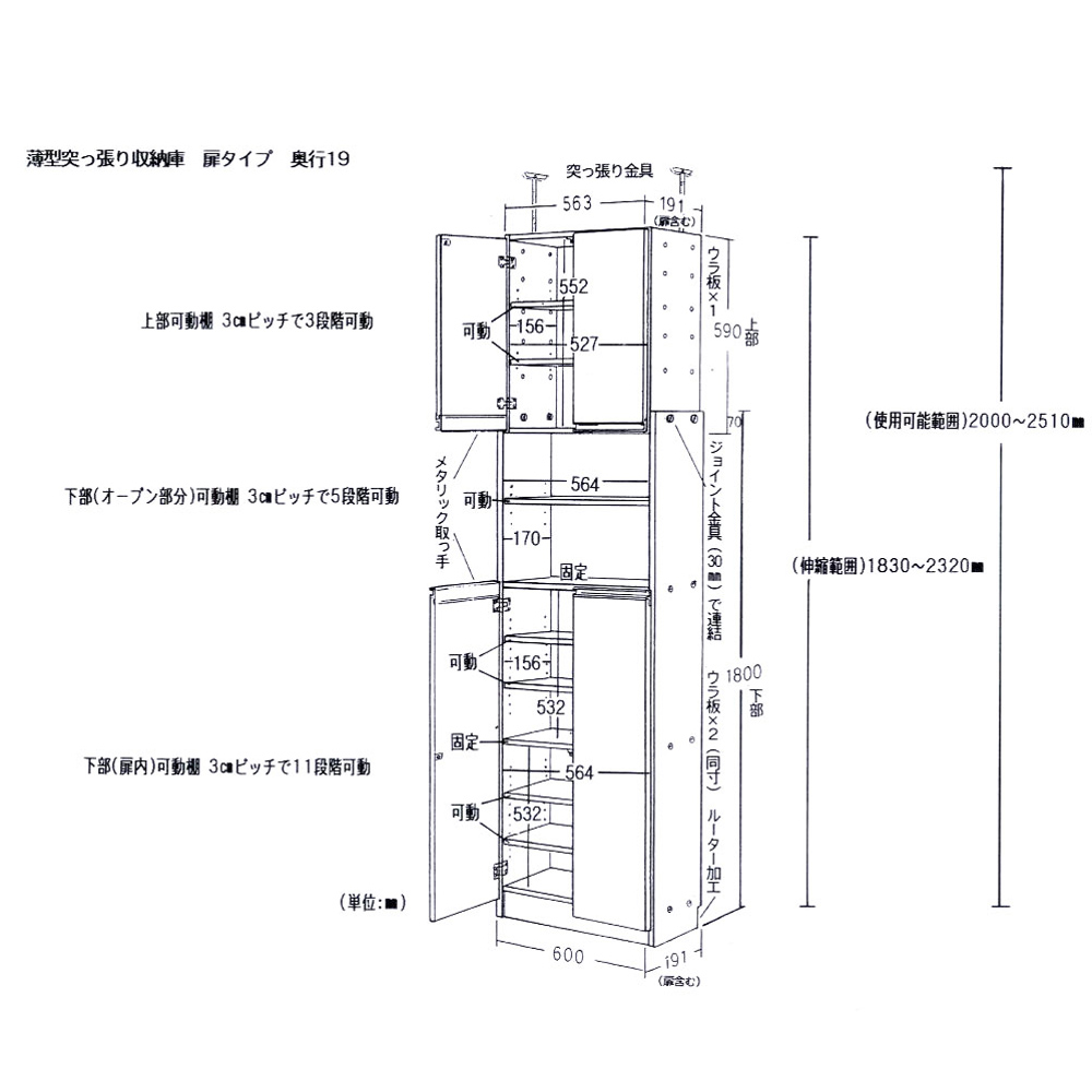 薄型で省スペースキッチン突っ張り収納庫 扉タイプ 幅60cm・奥行19cm キッチンボード キッチン収納 630302