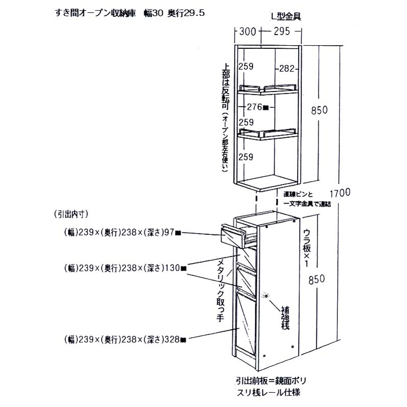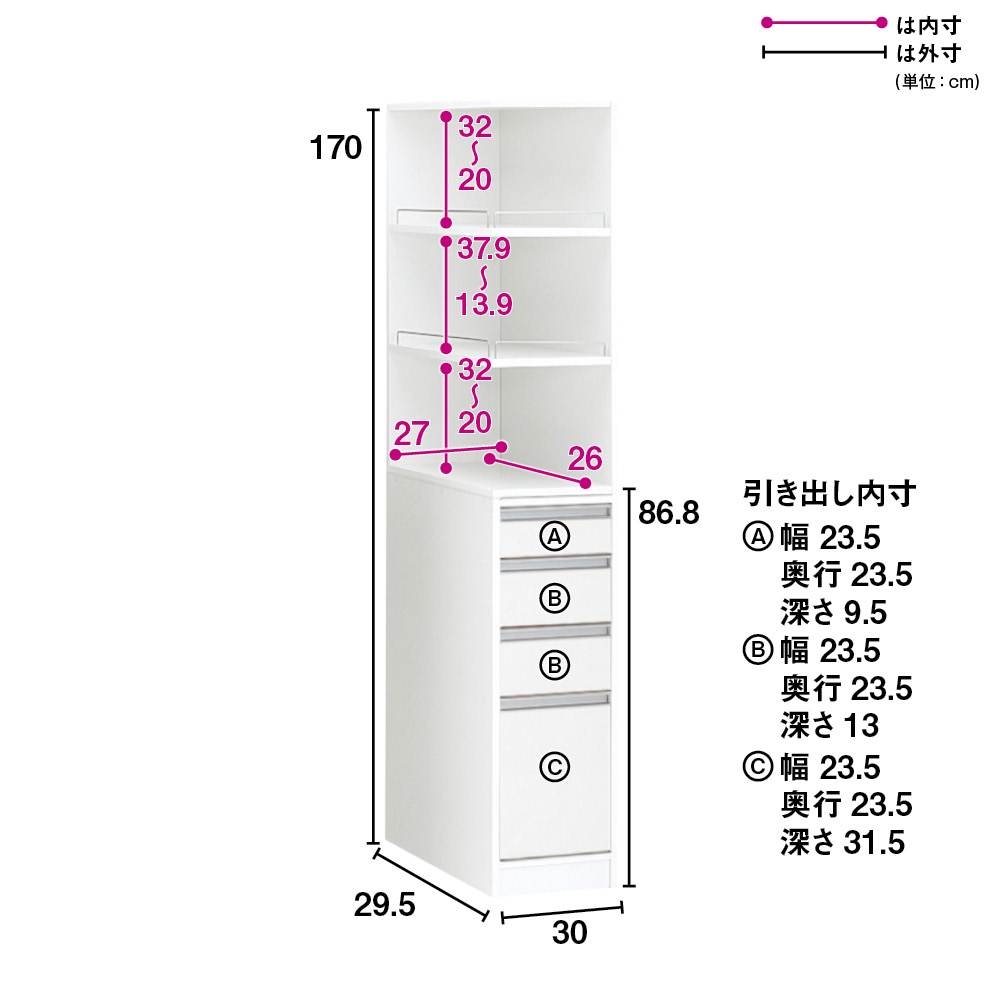 ■幅30奥行29.5高さ170、上部オープン棚内寸高さ各26、引き出し奥行23.5cm・重量約26kg