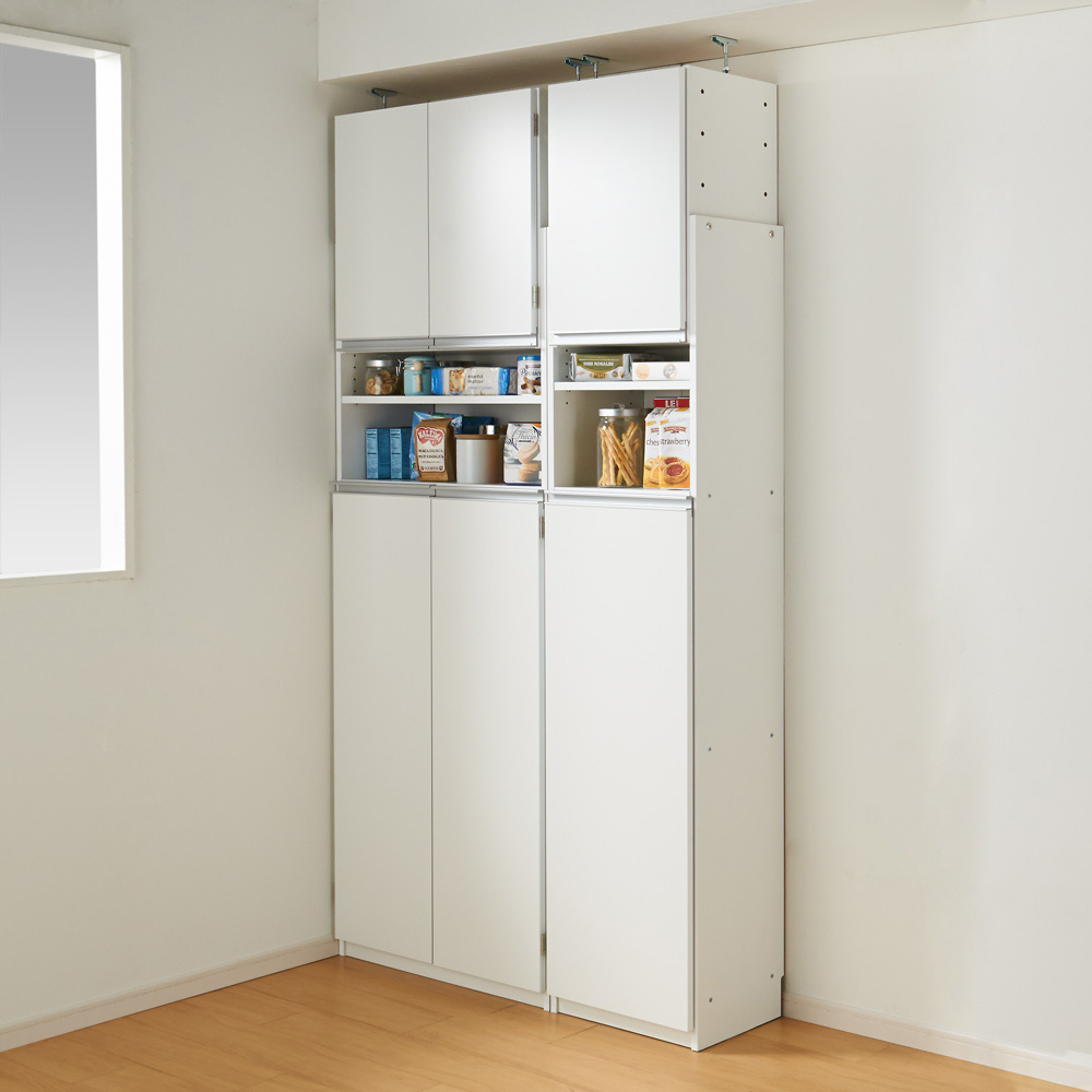 ◆狭いキッチンに置ける薄型省スペースタイプのキッチンストッカー。◆突っ張り上置き付きで天井いっぱいまで収納空間にできてたっぷり収納できます。