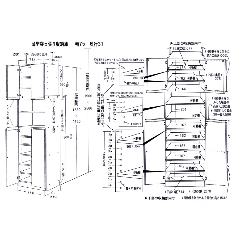 ■サイズ:幅75奥行31高さ(突っ張り部除く本体のみ)183~232cm・重量約45kg