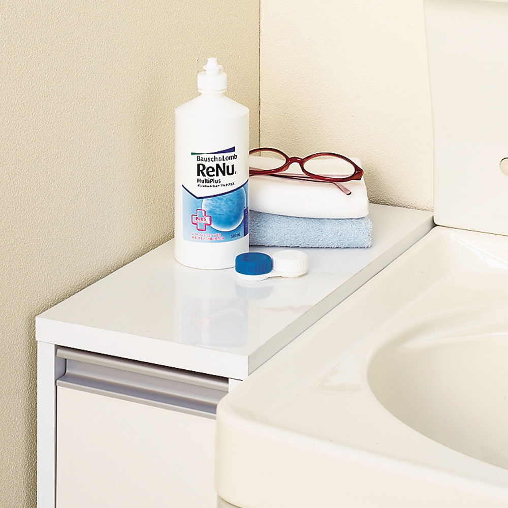 コンタクトレンズ用品を置くのにも便利な中天板。 ポリエステル化粧合板仕様でお手入れもラクラク。