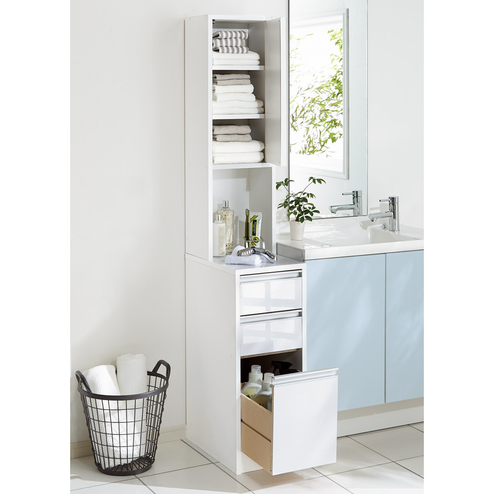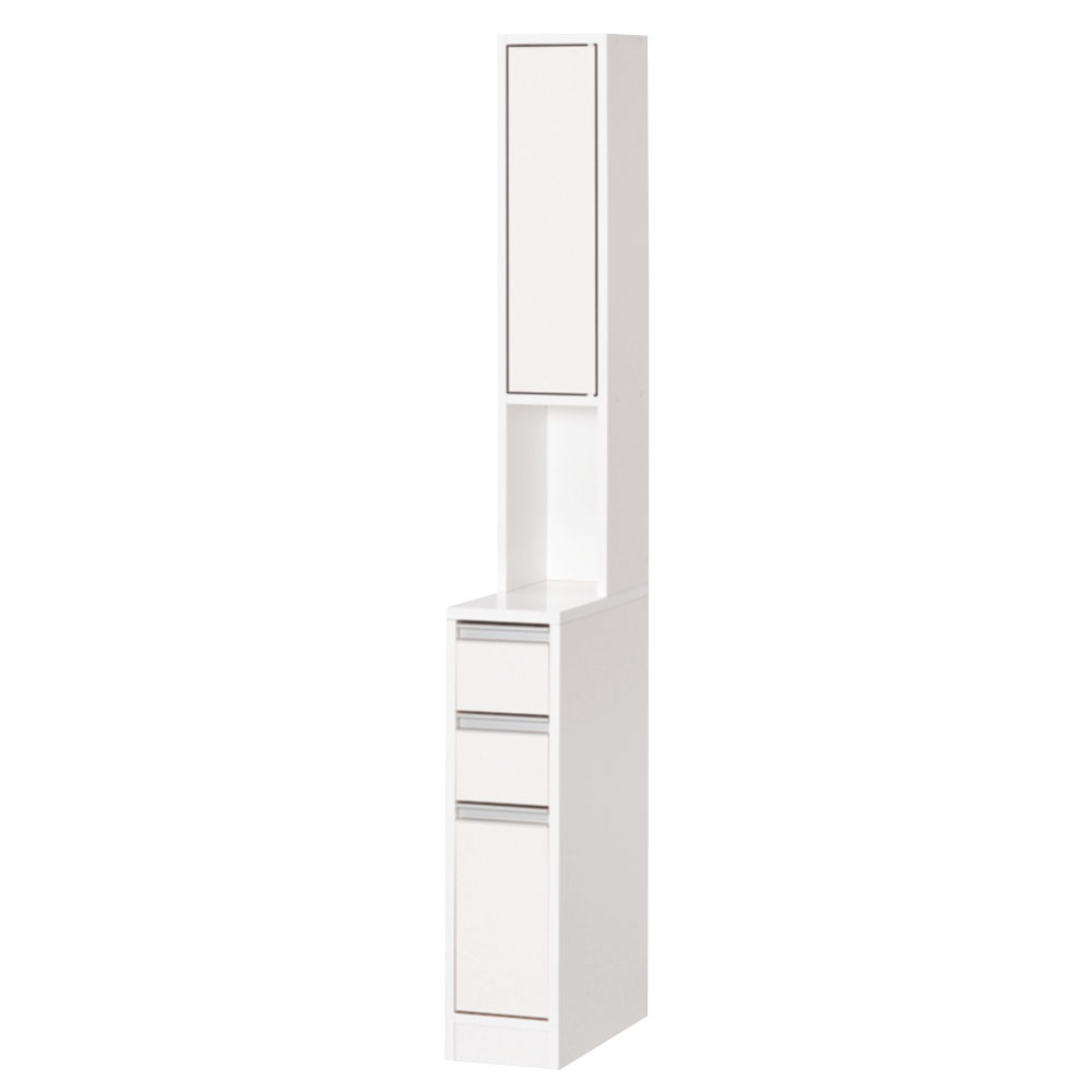 ・前面、天板は汚れてもお手入れがラクなポリエステル化粧合板 ・光沢仕上げで見た目もキレイな洗面所用すき間収納庫です。 ・最下段の深引き出しにはペットボトルも入る、引き出し高さ31.5センチ。 ※写真は幅25cmタイプです。