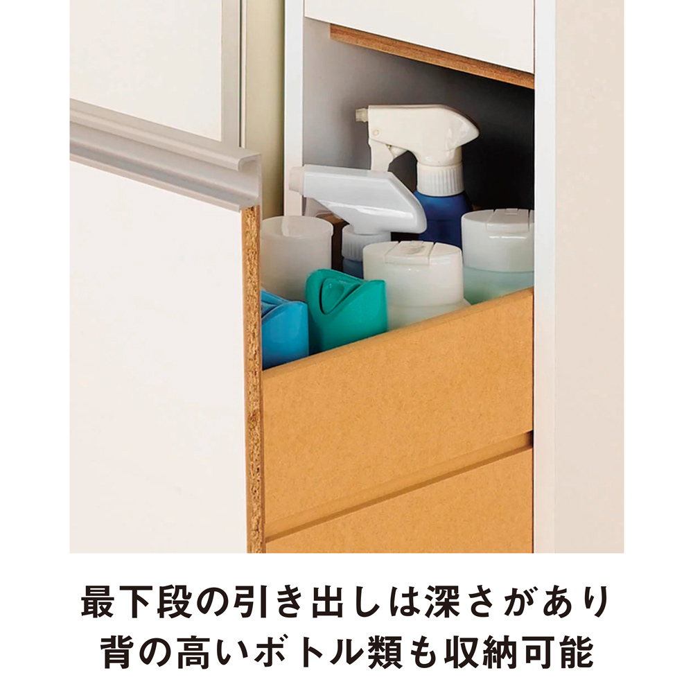 ●上部の扉は左右どちら開きにも設定できます。●最下段の引き出しは深さがあり、背の高い洗剤や柔軟剤のボトル類も収納可能です。