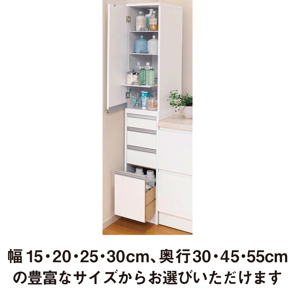 ●幅15・20・25・30cm、奥行30・45・55cmの豊富なサイズからお選びいただけるすき間家具です。●洗面台と洗濯機のすき間や洗面台と壁面のすき間におすすめのスリム収納です。