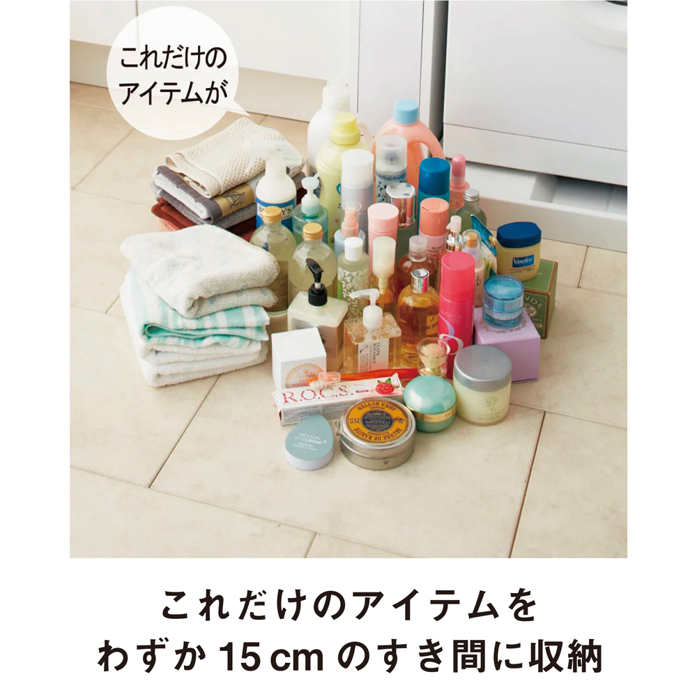 洗剤のボトルはもちろん、化粧品やストック、生活雑貨を一か所にまとめて整理整頓できます。(※写真は幅25cmタイプです。)
