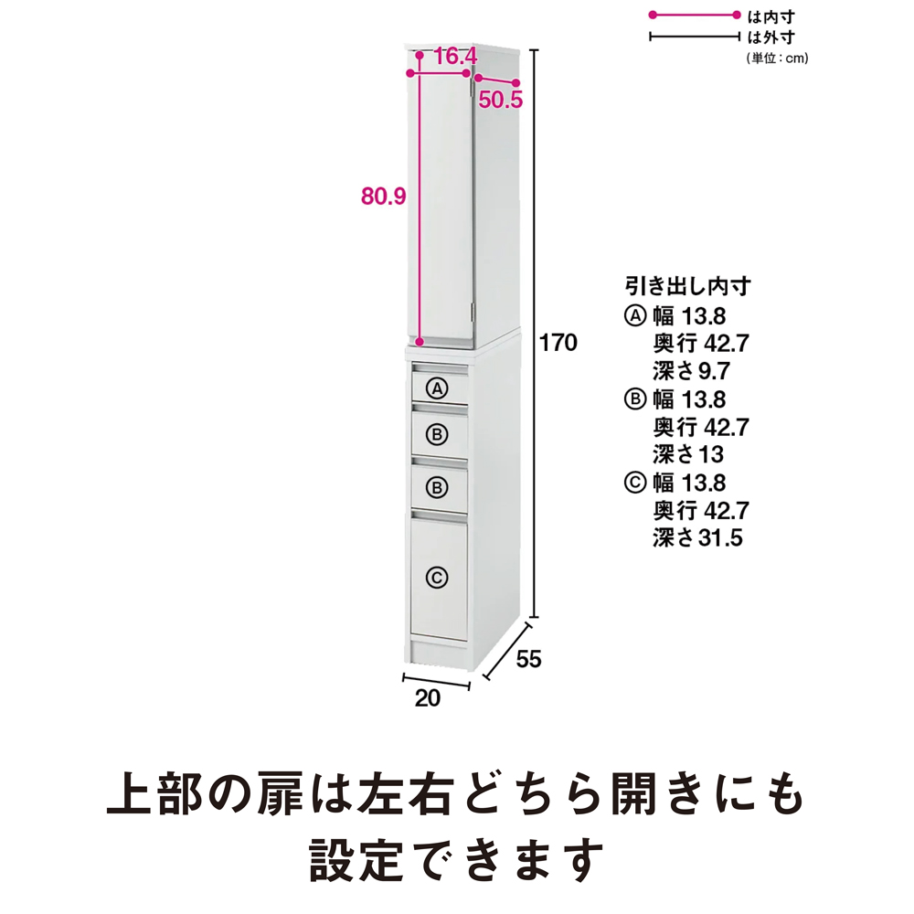 ■サイズ:幅20奥行55高さ170、引き出し奥行42.7cm、引き出し内寸…幅(約13.8)、高さ…小:9.7・中×2:13・大:31.5cm・重量約24kg