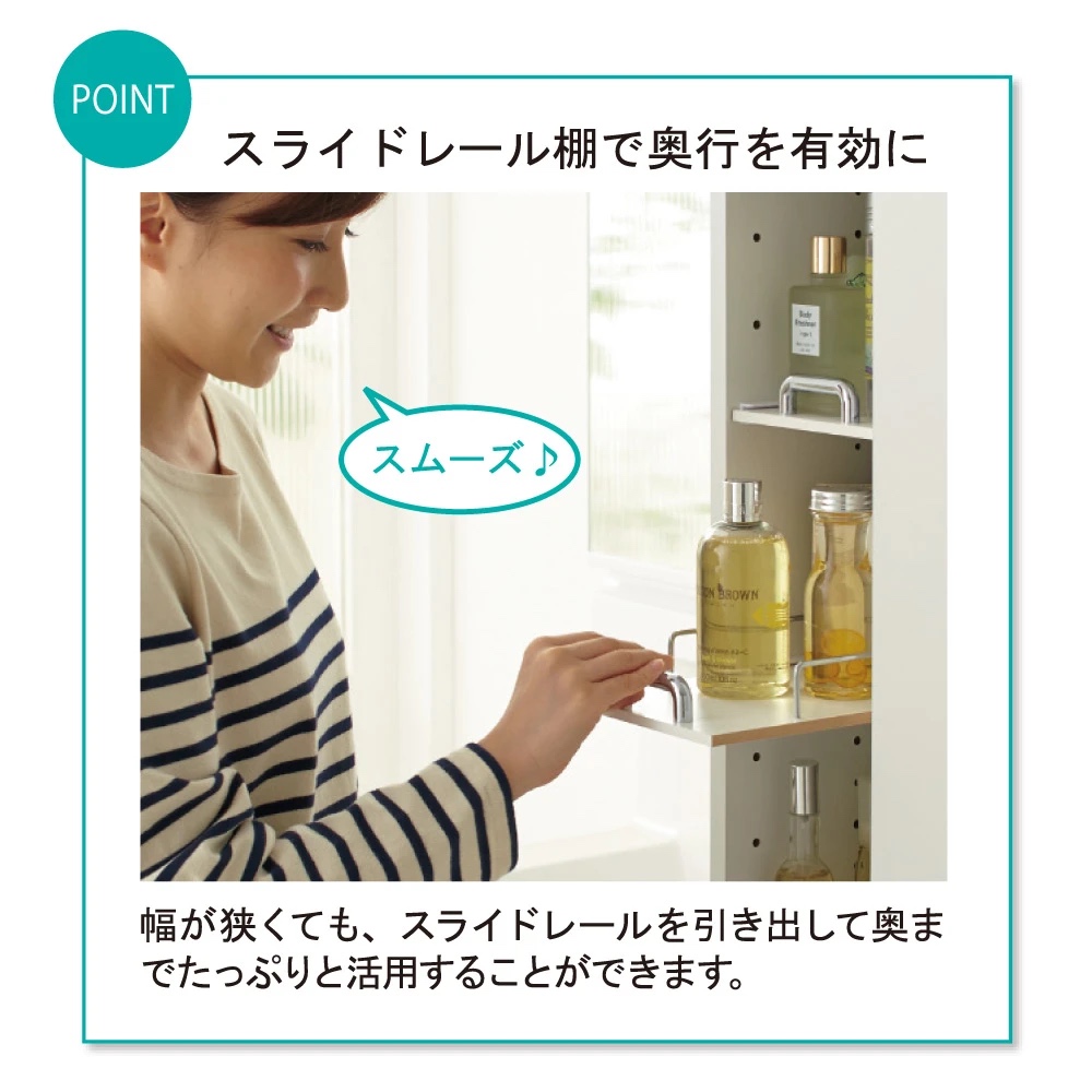 スライド棚と引き出し収納で洗面所まわりがスッキリ。(※写真は幅30cm奥行45cmタイプです。)
