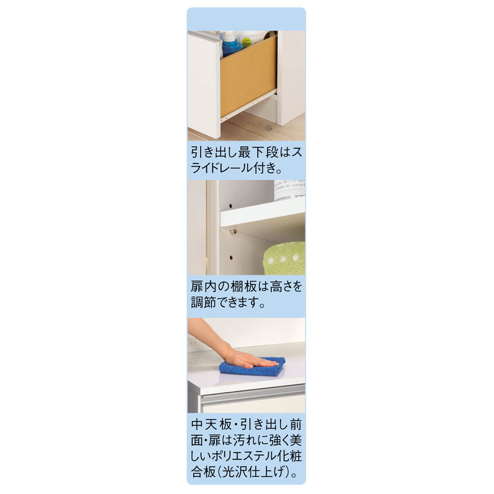 ●前面と天板には光沢のあるポリエステル化粧合板を使用しました。●お手入れが簡単な素材なので、水回りでも気兼ねなくお使いいただけます。