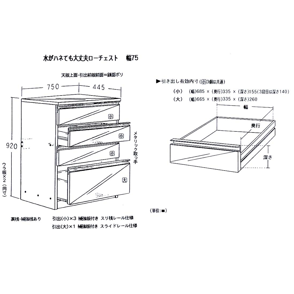 水回りでも安心の光沢洗面所チェスト ロータイプ・幅75cm 洗面所収納 隙間収納 トイレ 洗面所 ランドリー収納 631112