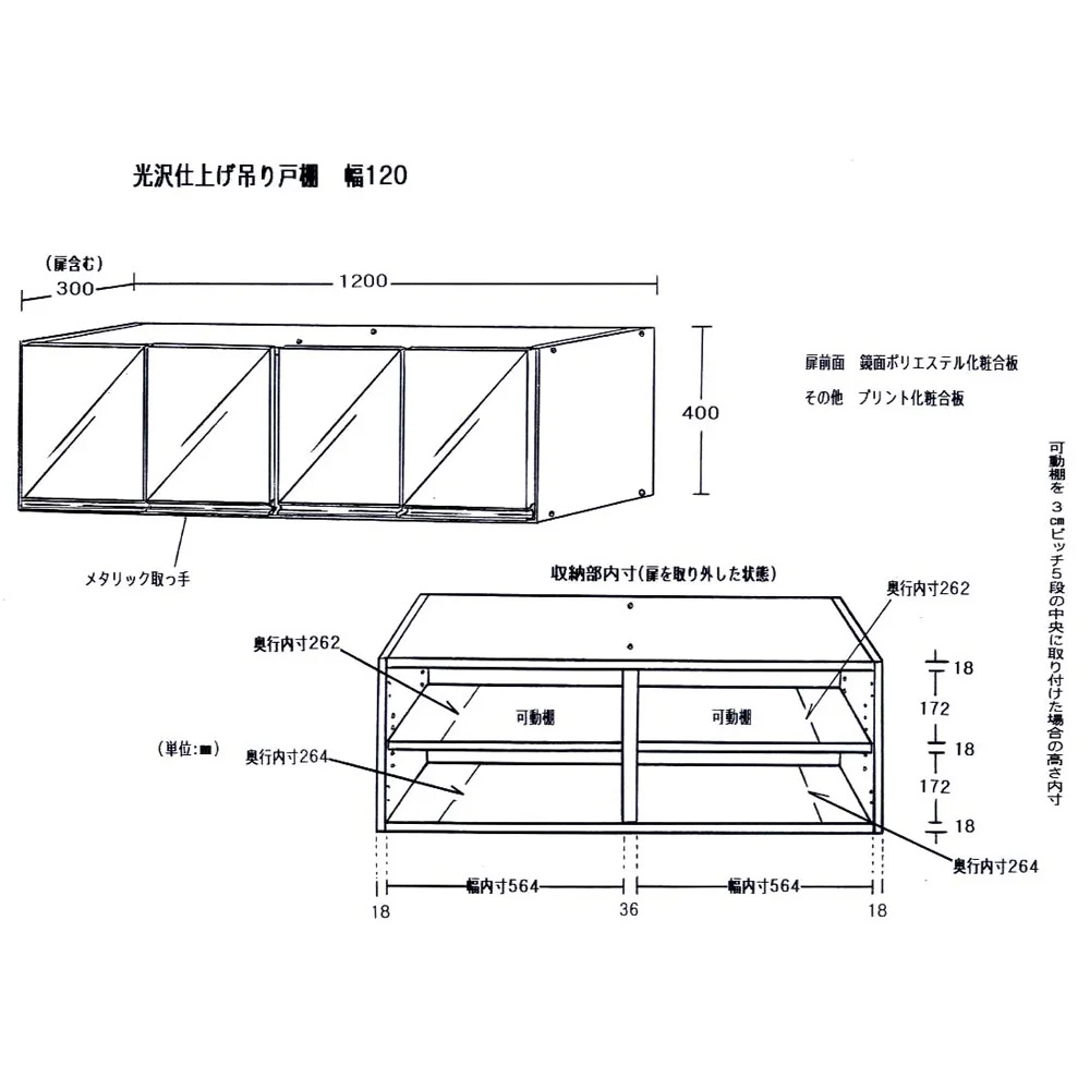光沢仕上げ吊り戸棚は以下のシリーズ商品がございます。※このページは横型 扉タイプ幅120cm高さ40cmの販売ページです。