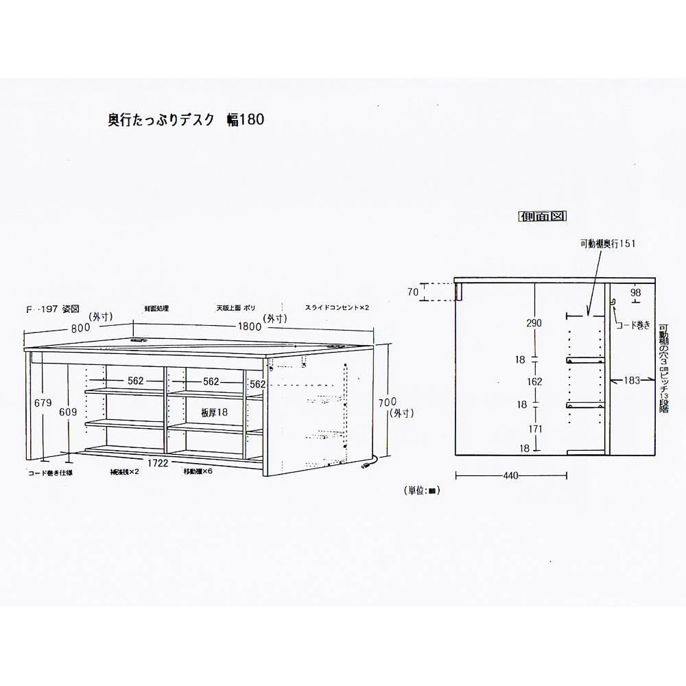 ≪デスク幅180≫ 詳細図(単位:mm)