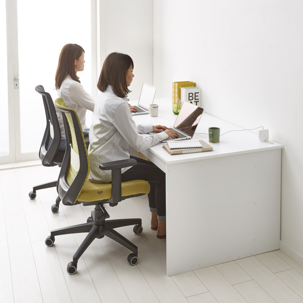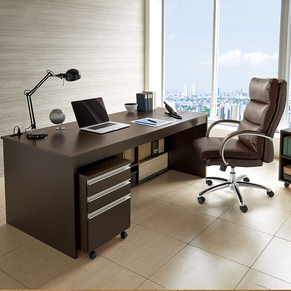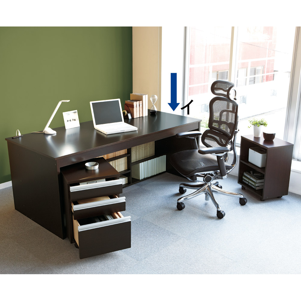 (イ)ダークブラウン 広々とした天板。SOHOワークスペースを作り出します。チェアは、別売りの「エルゴヒューマン プロ」です。