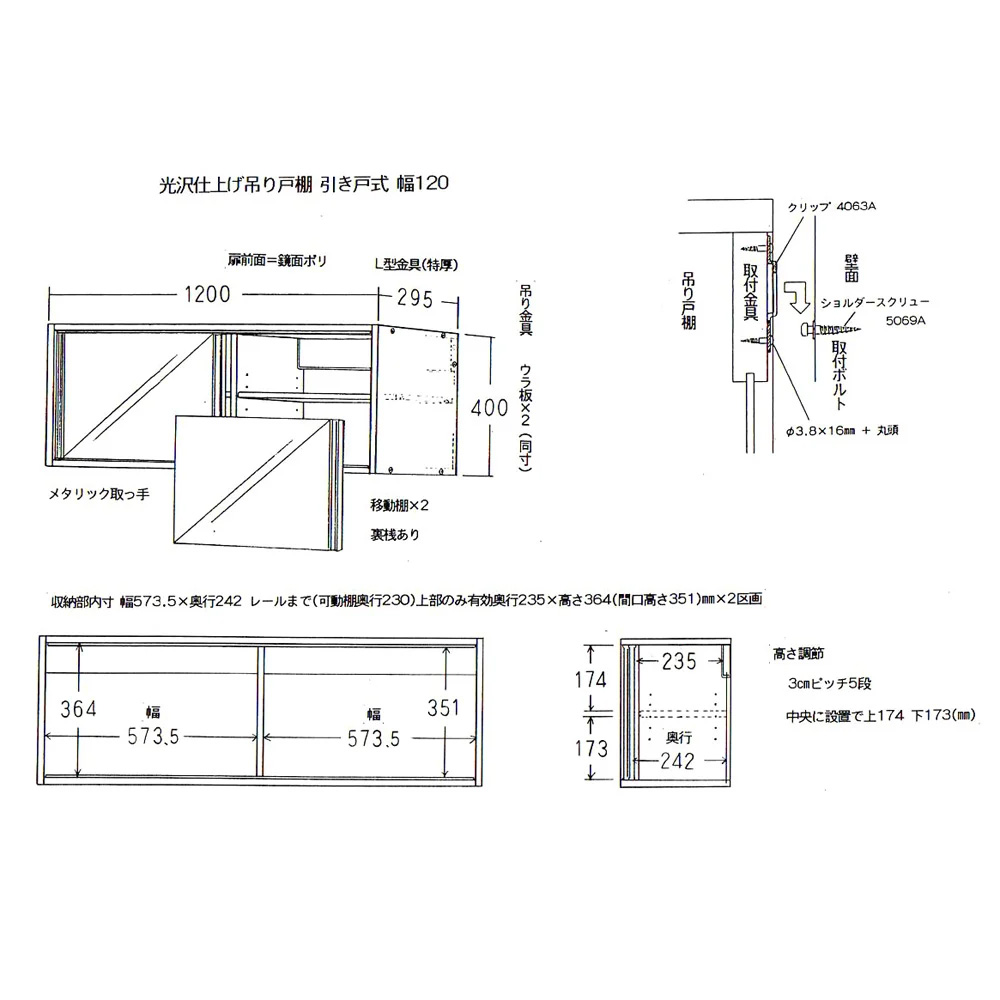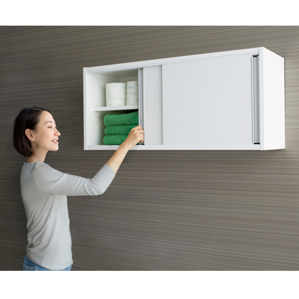光沢仕上げ吊り戸棚 横型引き戸タイプ 幅120cm高さ40cm 洗面所収納 隙間収納 トイレ 洗面所 ランドリー収納 631206