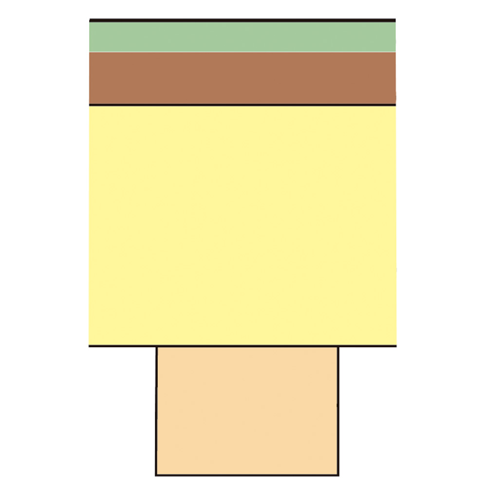 【畳部の断面図】 グリーン…い草(天然素材) ブラウン…ウレタンパッド0.5cm(圧縮時0.2~0.3cm) イエロー…パーチクルボード(底部1.5cm厚) オレンジ…ズレ防止用合板(0.9cm厚)