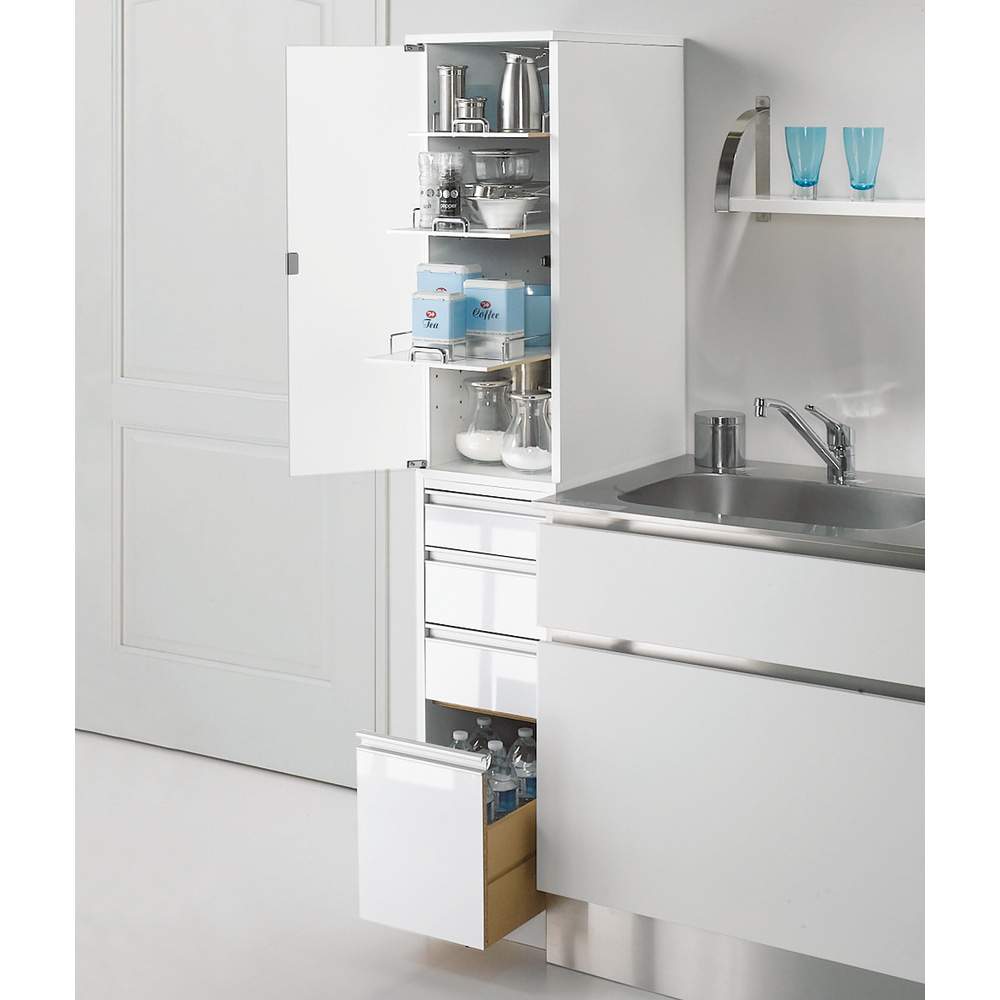 ◆アクリル扉のうっすらと見える上質な透明感。隙間だからこそ上品に収納することが、キッチンを清潔に見せるコツ。◆引き出し前板部は、清潔感のある「光沢ホワイト」色で、キッチンを明るく演出します。