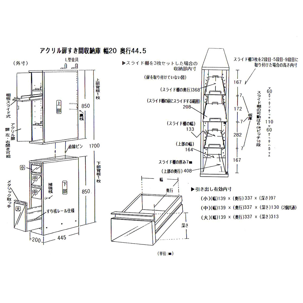 ■幅20奥行44.5(引出奥行33.5)高さ170cm・重量約20kg