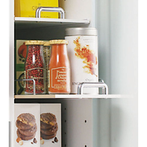 ◆扉内の棚は奥のものまで取り出しやすいようスライドさせて手前に引き出すことができます。◆各段の棚には収納物の落下を防止するこぼれ止めバー付き。