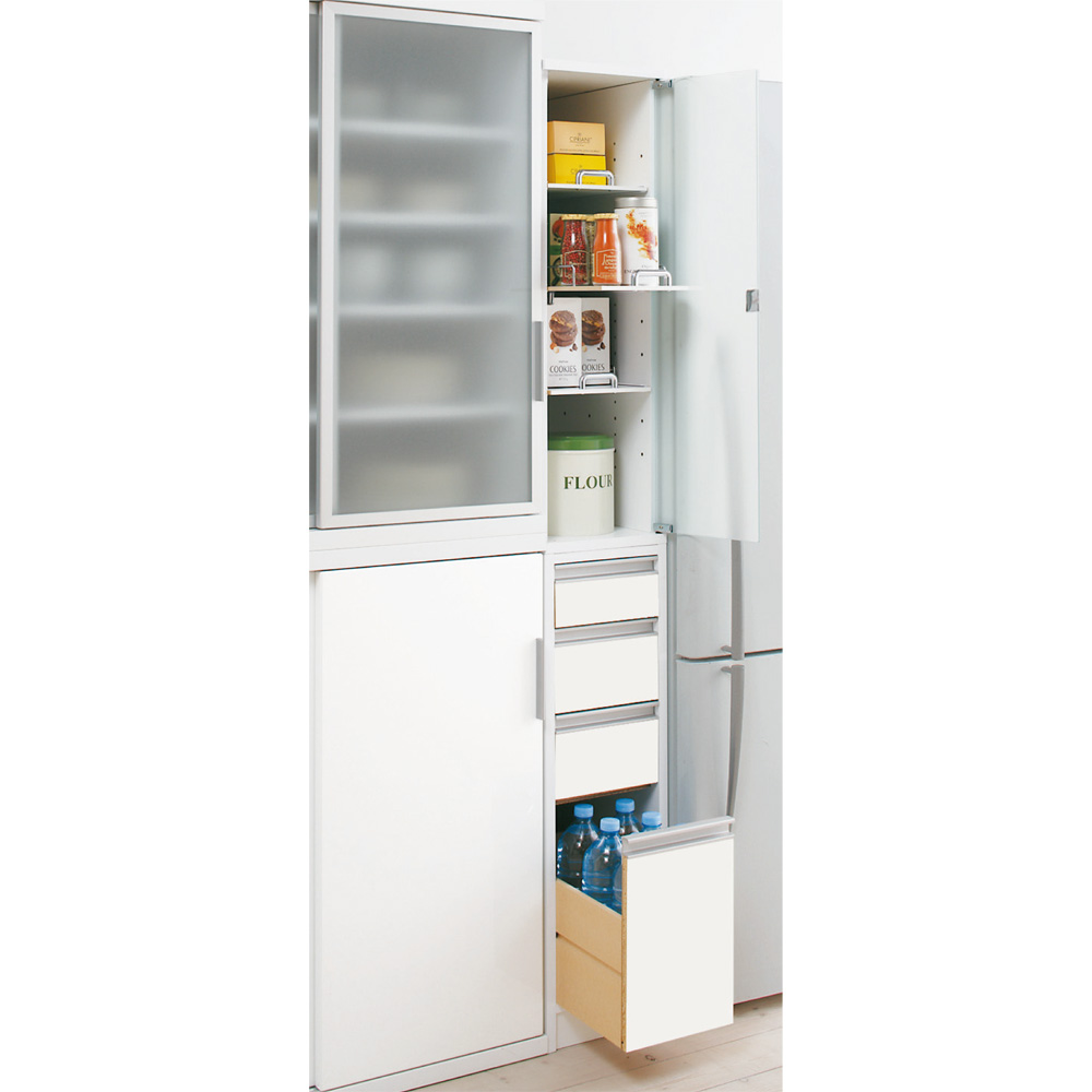 ◆最下段の引出しは、ペットボトル収納を可能にする高さを確保。
