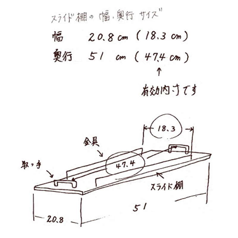 奥のものも取り出しやすい スライド棚を採用。ストッパー付きです。