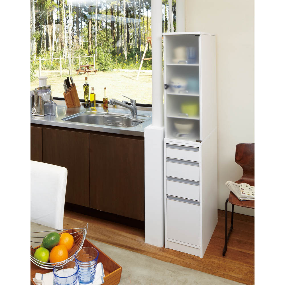 ◆アクリル扉のうっすらと見える上質な透明感。隙間だからこそ上品に収納することが、キッチンを清潔に見せるコツ。◆引き出し前板部は、清潔感のある「光沢ホワイト」色で、キッチンを明るく演出します。