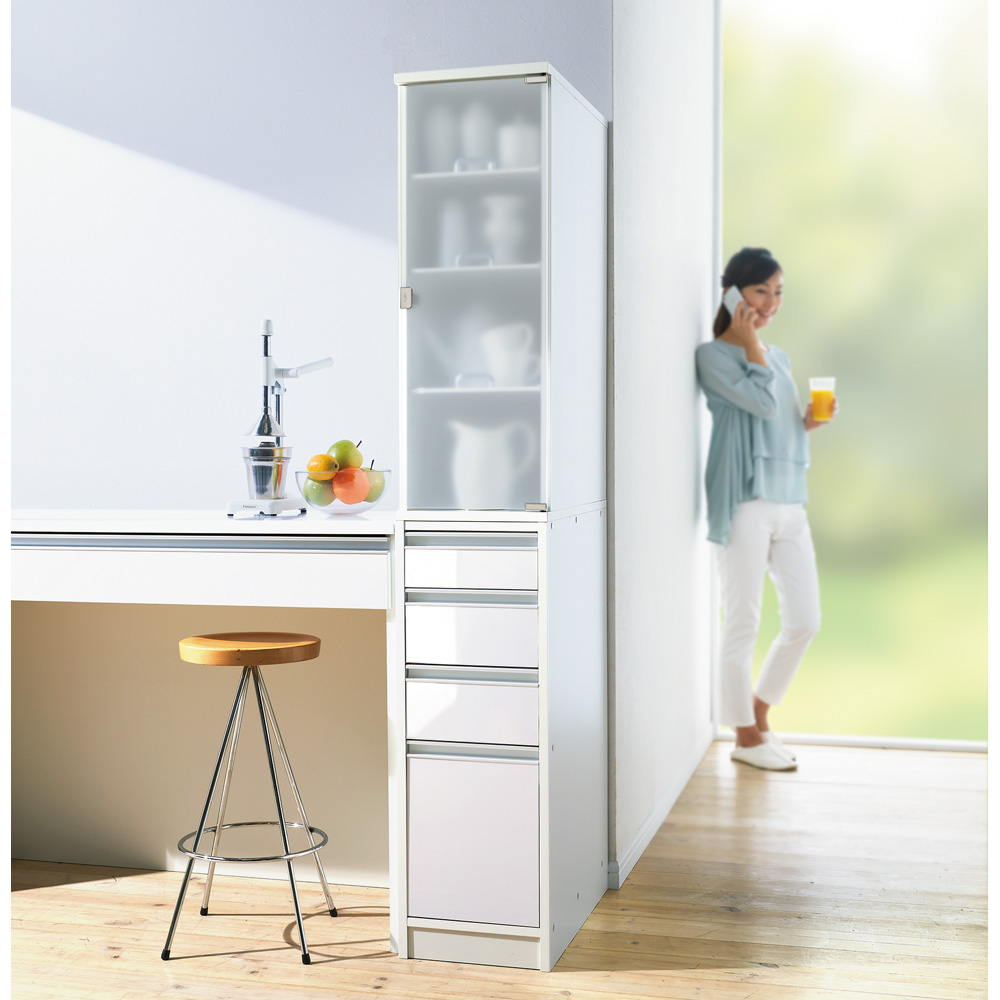 ◆アクリル扉のうっすらと見える上質な透明感。隙間だからこそ上品に収納することが、キッチンを清潔に見せるコツ。◆引き出し前板部は、清潔感のある「光沢ホワイト」色で、キッチンを明るく演出します。