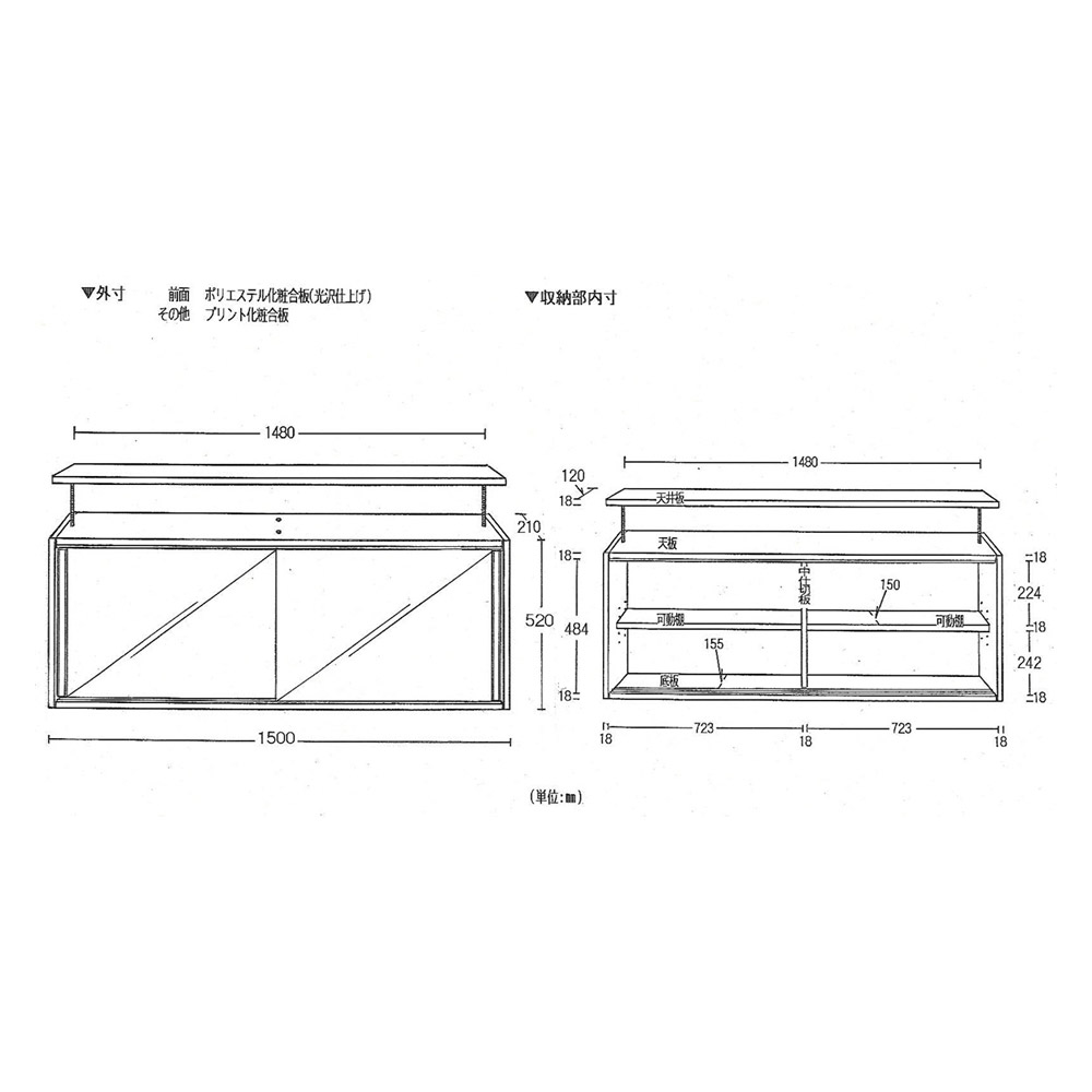 ■前面…ポリエステル化粧合板(光沢仕上げ)、天板・側面…化粧合板