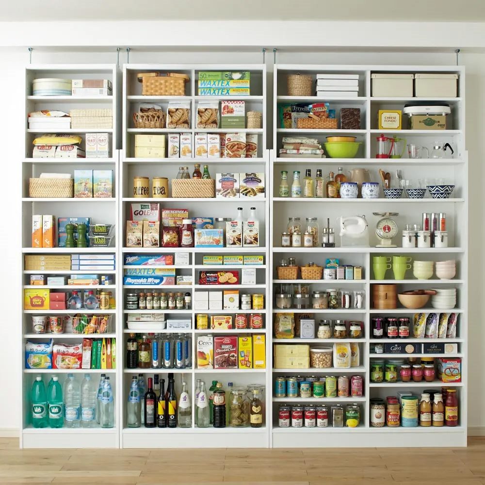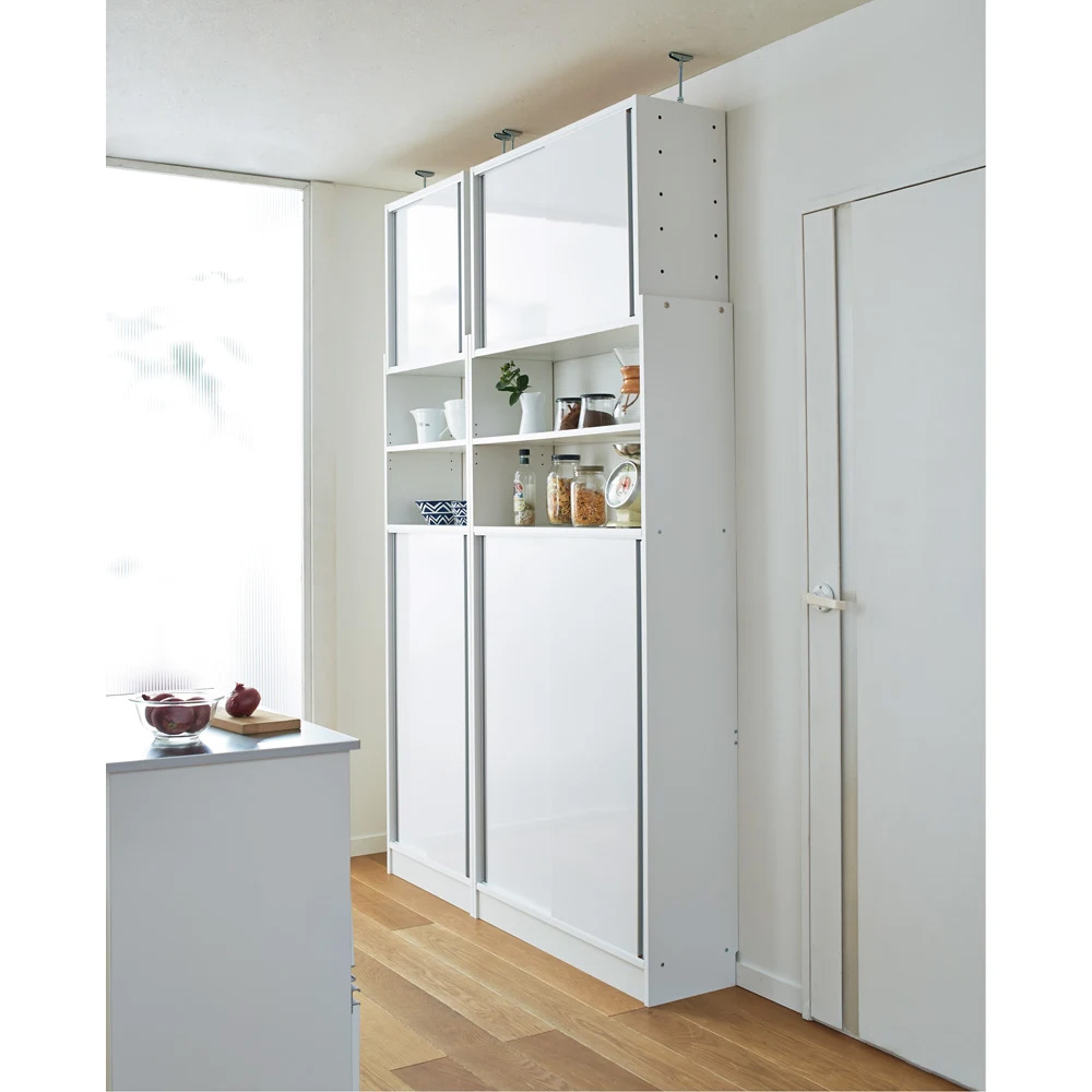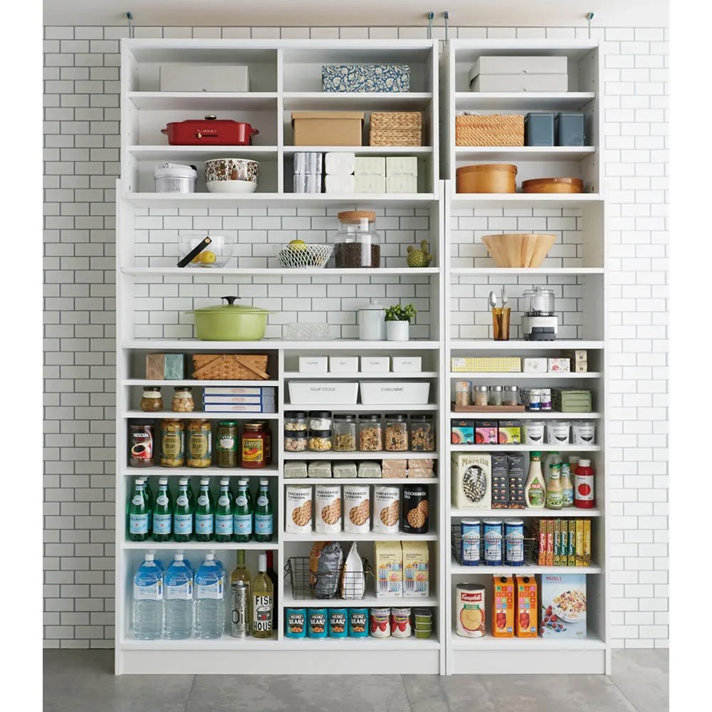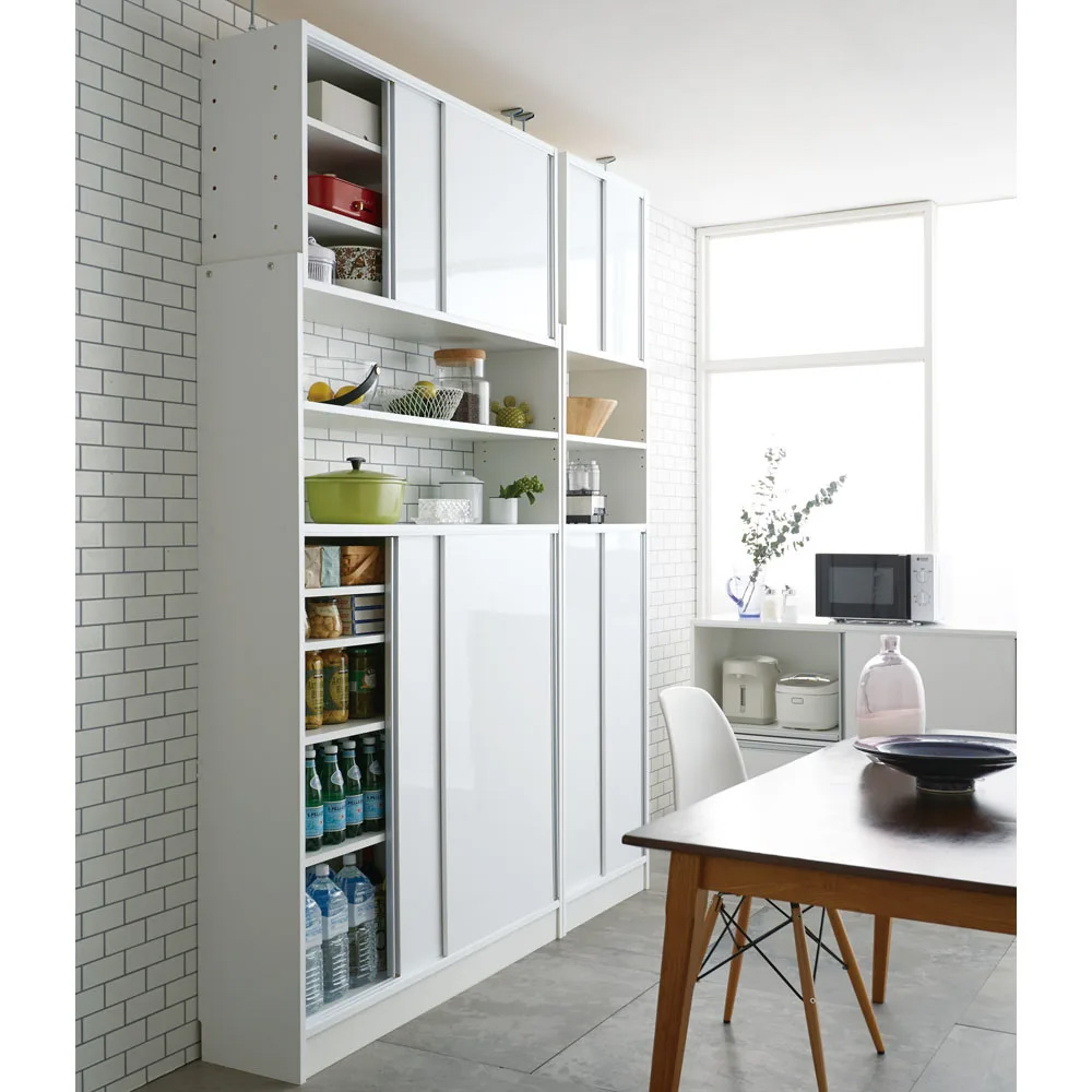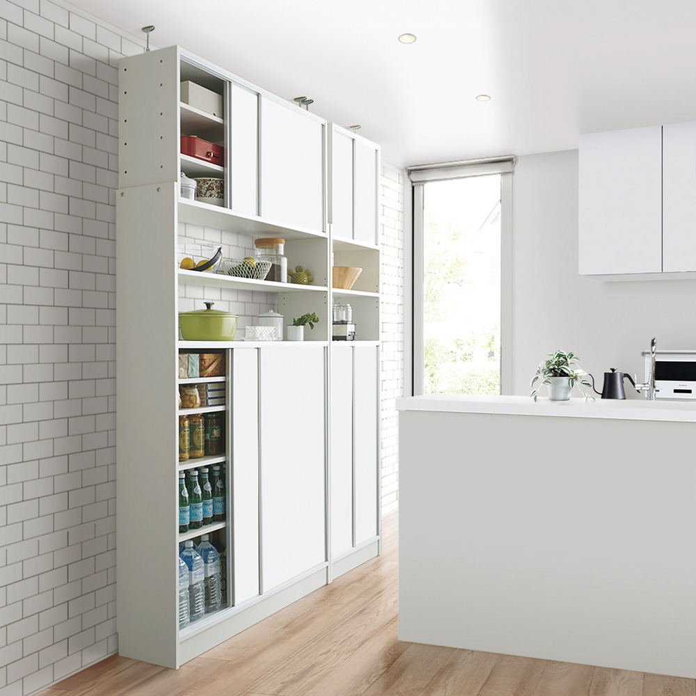 コーディネート例(ホワイト 左:幅120cm、右:幅60cm)大量のストックを隠せる「薄型×引き戸」キッチン収納狭いキッチンでも置ける、奥行30cmの薄型引き戸パントリー収納庫。仕舞う場所に困る食材のストックや調味料、食器類などをすっきり収納し、引き戸でサッと目隠し。突っ張り式で薄型なので、人の行き来の多い場所でも邪魔になりません。光沢感のあるデザインがキッチンを明るく保ちます。