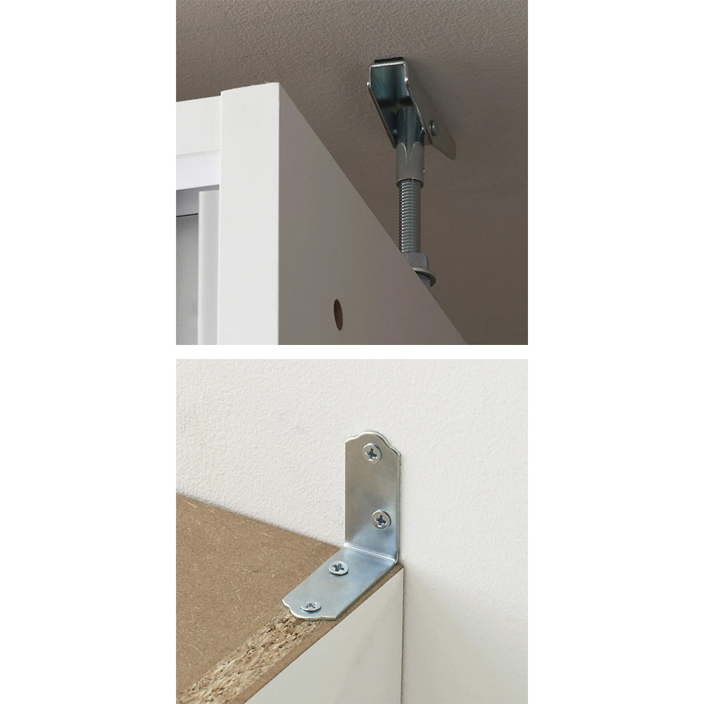 (写真上)天井へ突っ張り金具を使って安定させます。(写真下)突っ張らずに転倒防止金具で使用する事もできます。