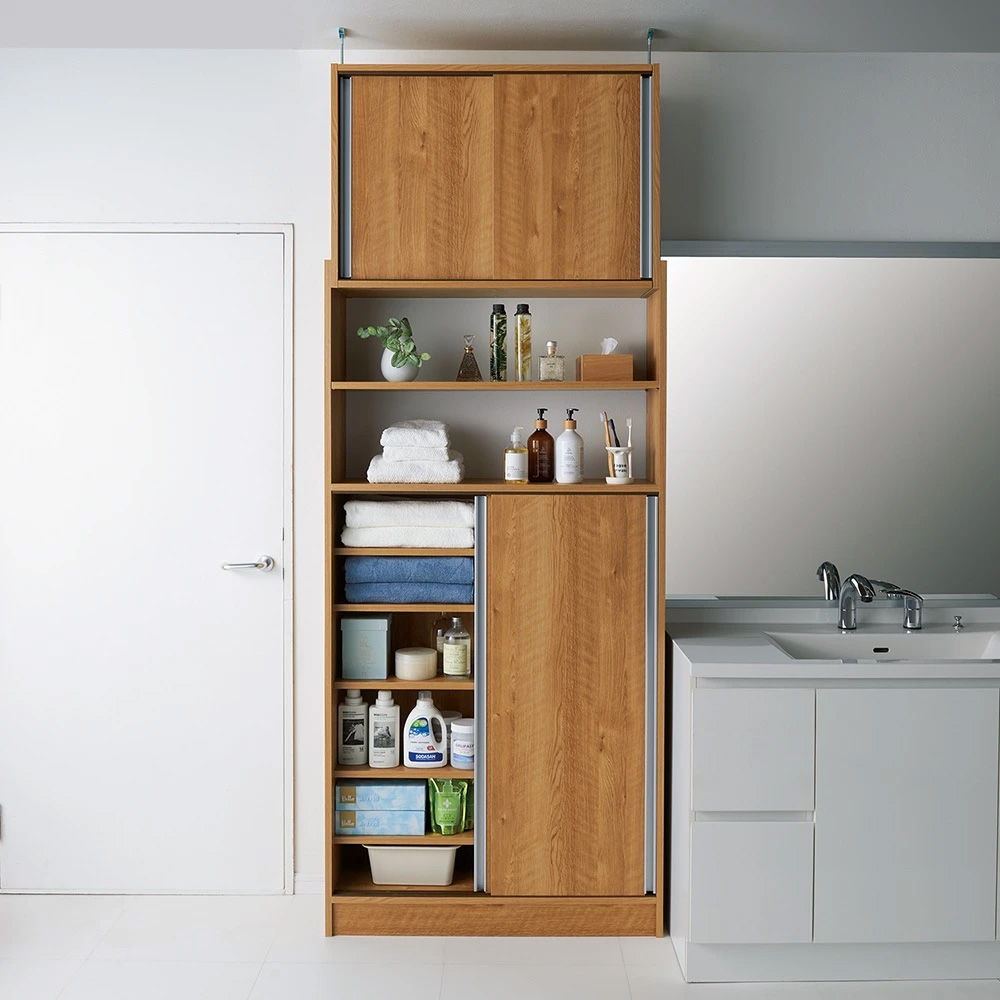 • (イ)ブラウン 洗面所にも 洗面所の限られたスペースにもぴったり置けます。可動棚は収納物に合わせて3cm間隔で設定でき、タオルや洗剤などもたっぷり収納できます。