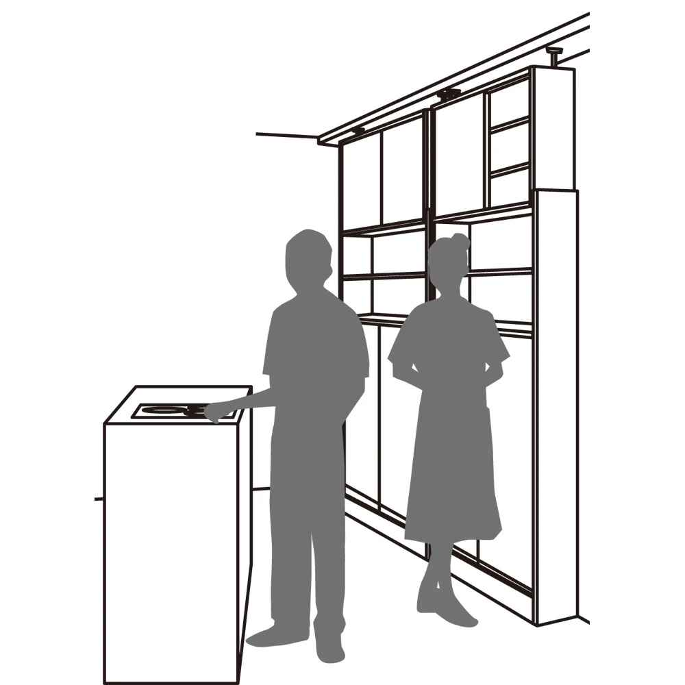 • (ア)ホワイト 収納庫を使っているときもすれ違うことが出来る薄型引き戸設計なので、マンションやシステムキッチンのお家にもおすすめです。