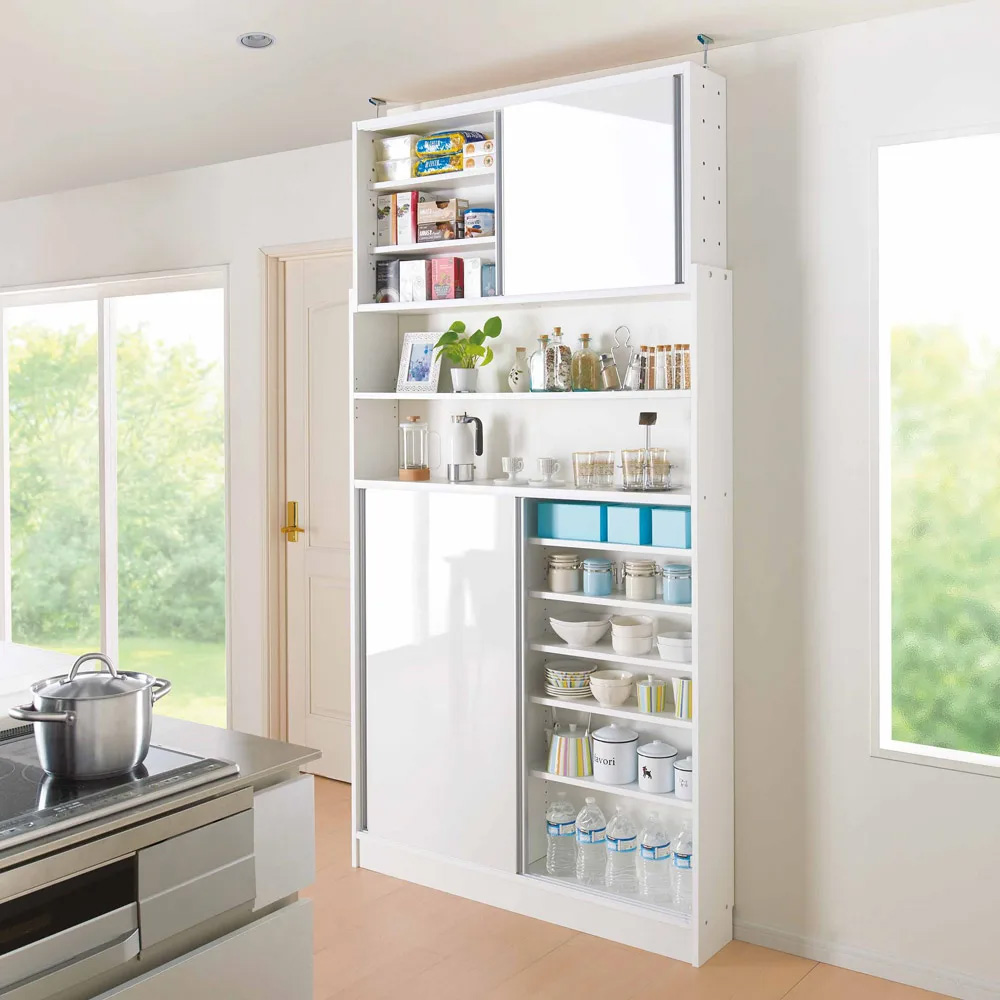 コーディネート例(ホワイト 左:幅60cm、右:幅90cm)大量のストックを隠せる「薄型×引き戸」キッチン収納狭いキッチンでも置ける、奥行30cmの薄型引き戸パントリー収納庫。仕舞う場所に困る食材のストックや調味料、食器類などをすっきり収納し、引き戸でサッと目隠し。突っ張り式で薄型なので、人の行き来の多い場所でも邪魔になりません。光沢感のあるデザインがキッチンを明るく保ちます。