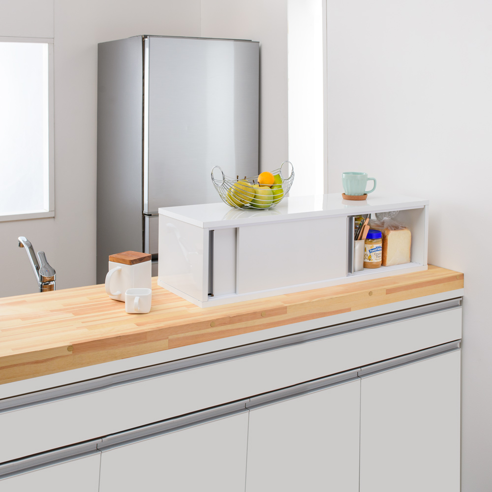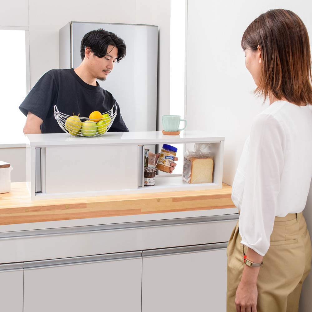 幅120cmタイプは大容量!!使い方の難しかったカウンター上をモダンに彩る収納家具です。前面・背面どちらからも取り出せます。