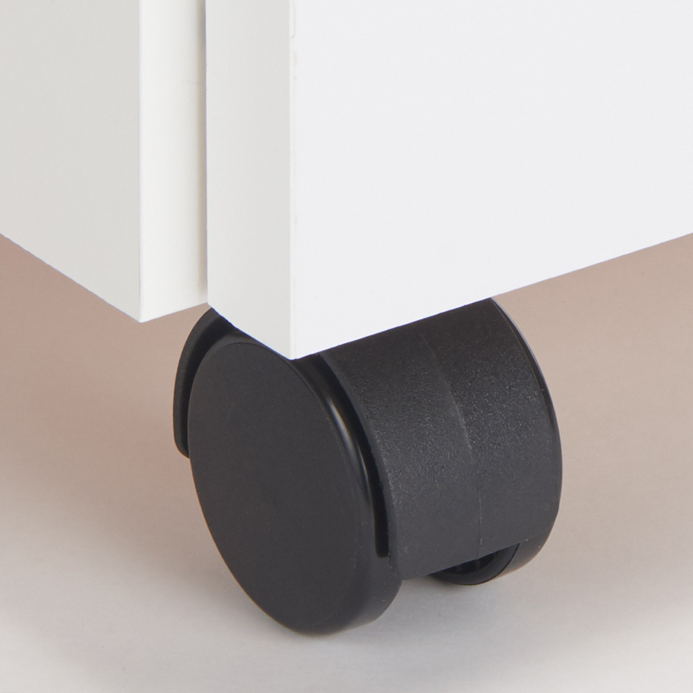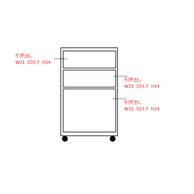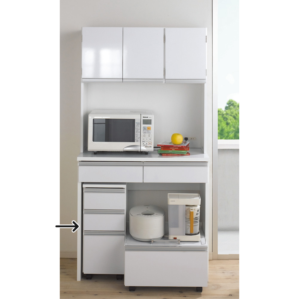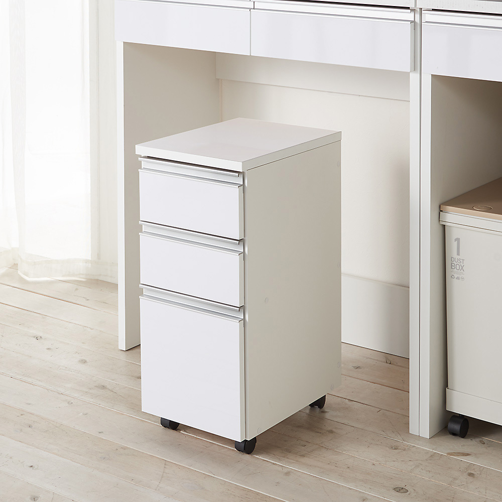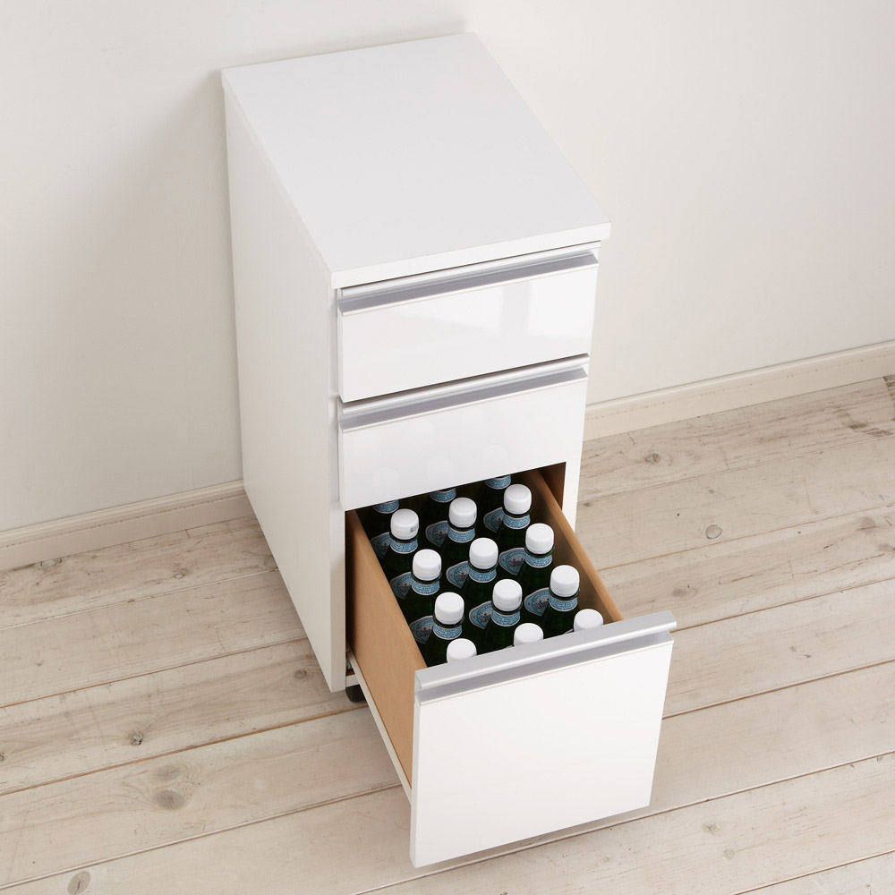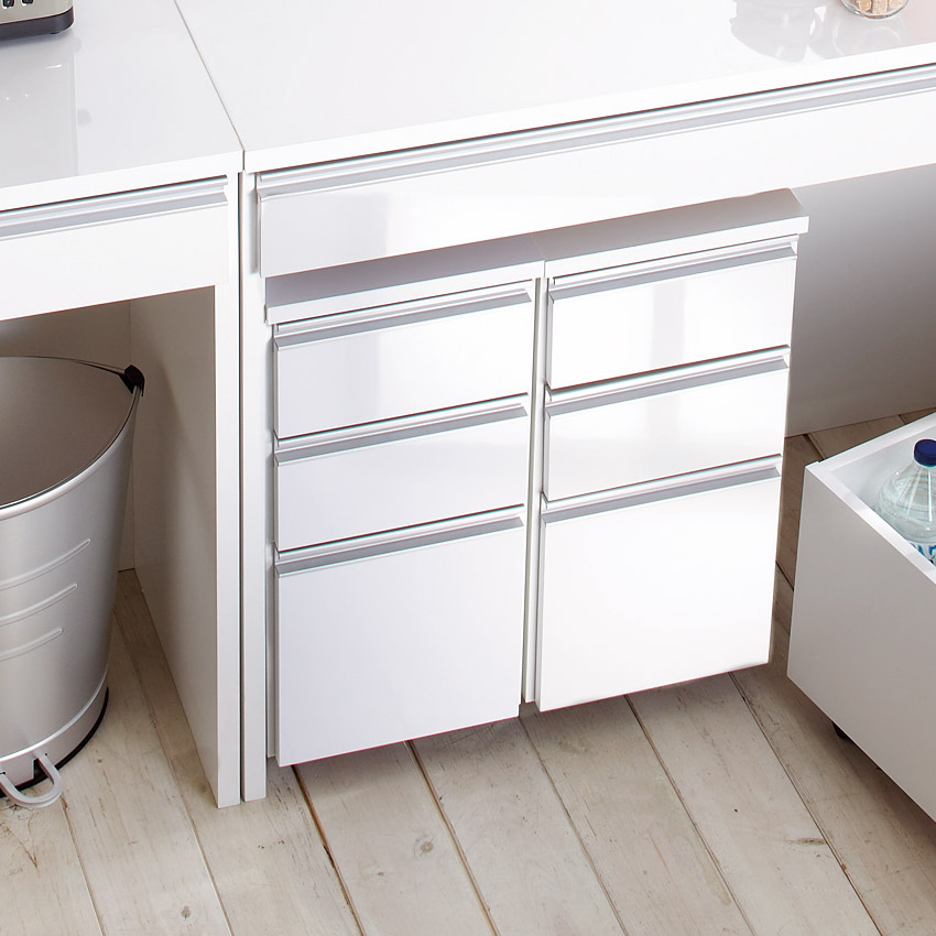 シリーズ商品のカウンターやキッチンボードの下に収納できる、三段の引き出し付きチェスト。キャスター付きから、移動もラクラク。