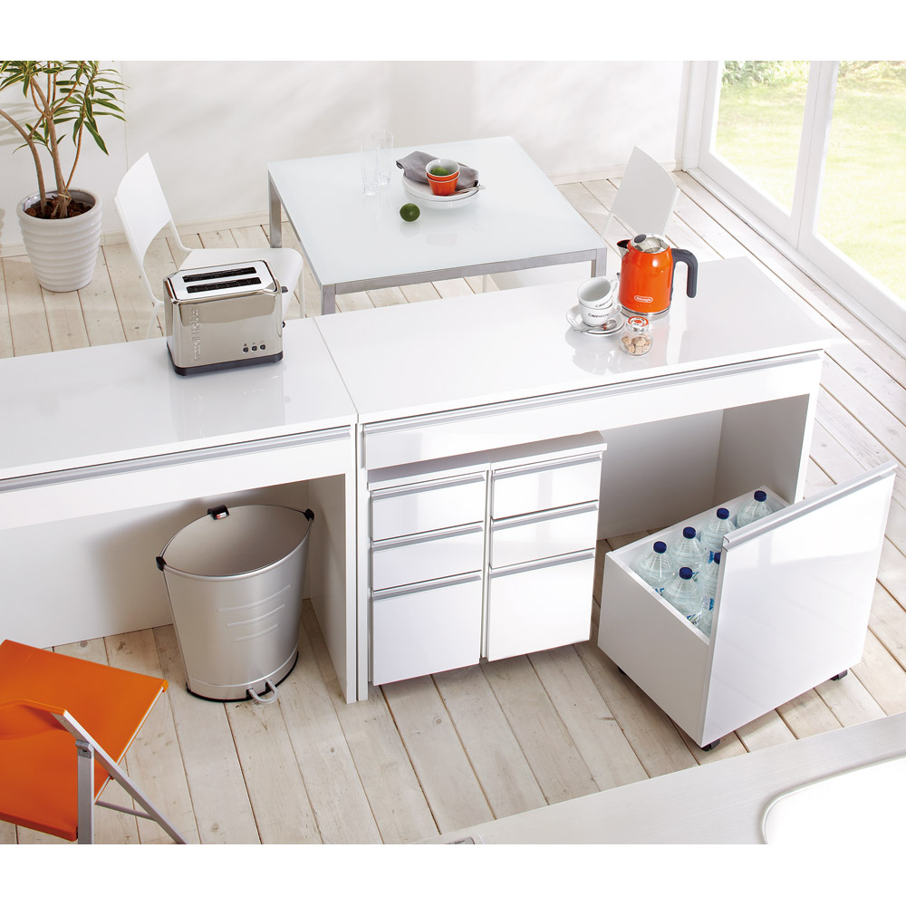 シリーズ商品のカウンター、キッチンボードの下がオープン仕様なので、床置き収納が可能。この「魔法の空間」に買い置きもダストボックスも収納してキッチンをすっきり。チェスト、ワゴンを組み合わせれば、使いやすいキッチン収納に。
