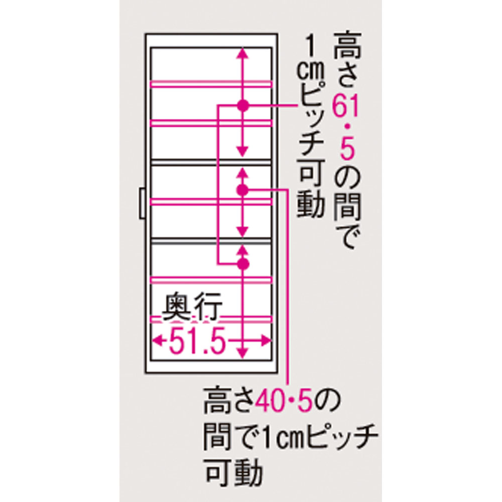 ◆収納棚板の高さはお好みに合わせて1cm間隔で調整できるので収納物に合わせて調整可能です。