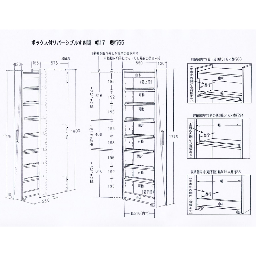 ボックス付きリバーシブル すき間収納庫 幅17奥行58cm 洗面所収納 隙間収納 トイレ 洗面所 ランドリー収納 630052