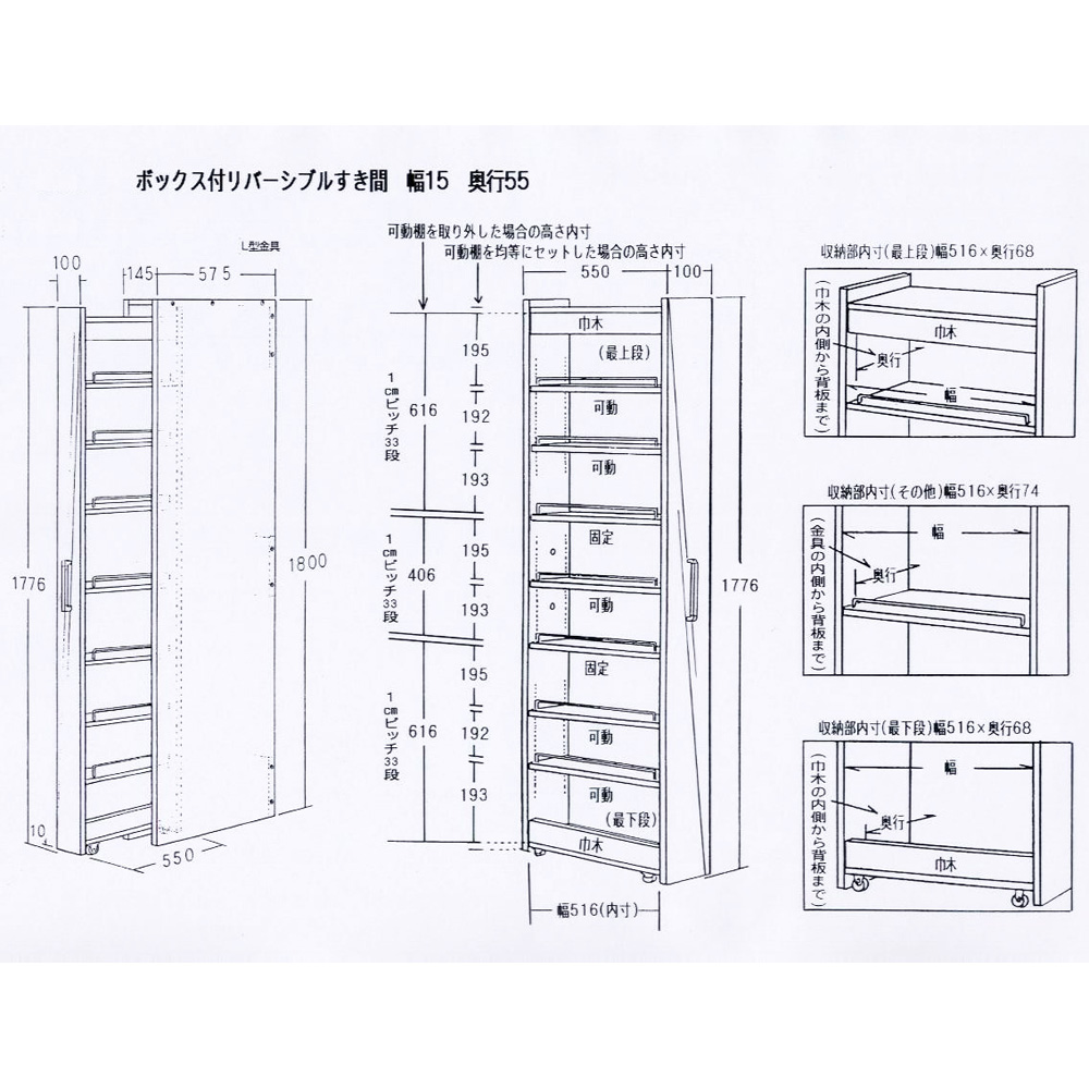 ボックス付きリバーシブル すき間収納庫 幅15奥行58cm 洗面所収納 隙間収納 トイレ 洗面所 ランドリー収納 630051