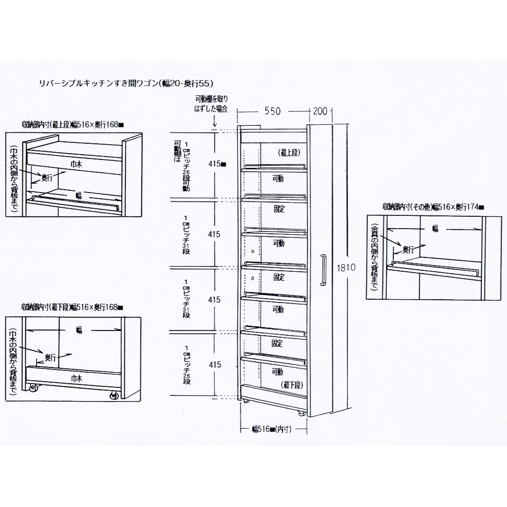 [幅20奥行55cm] リバーシブルキッチンすき間収納ワゴン 日本製 キッチンストッカー 隙間収納 キッチン収納 630043