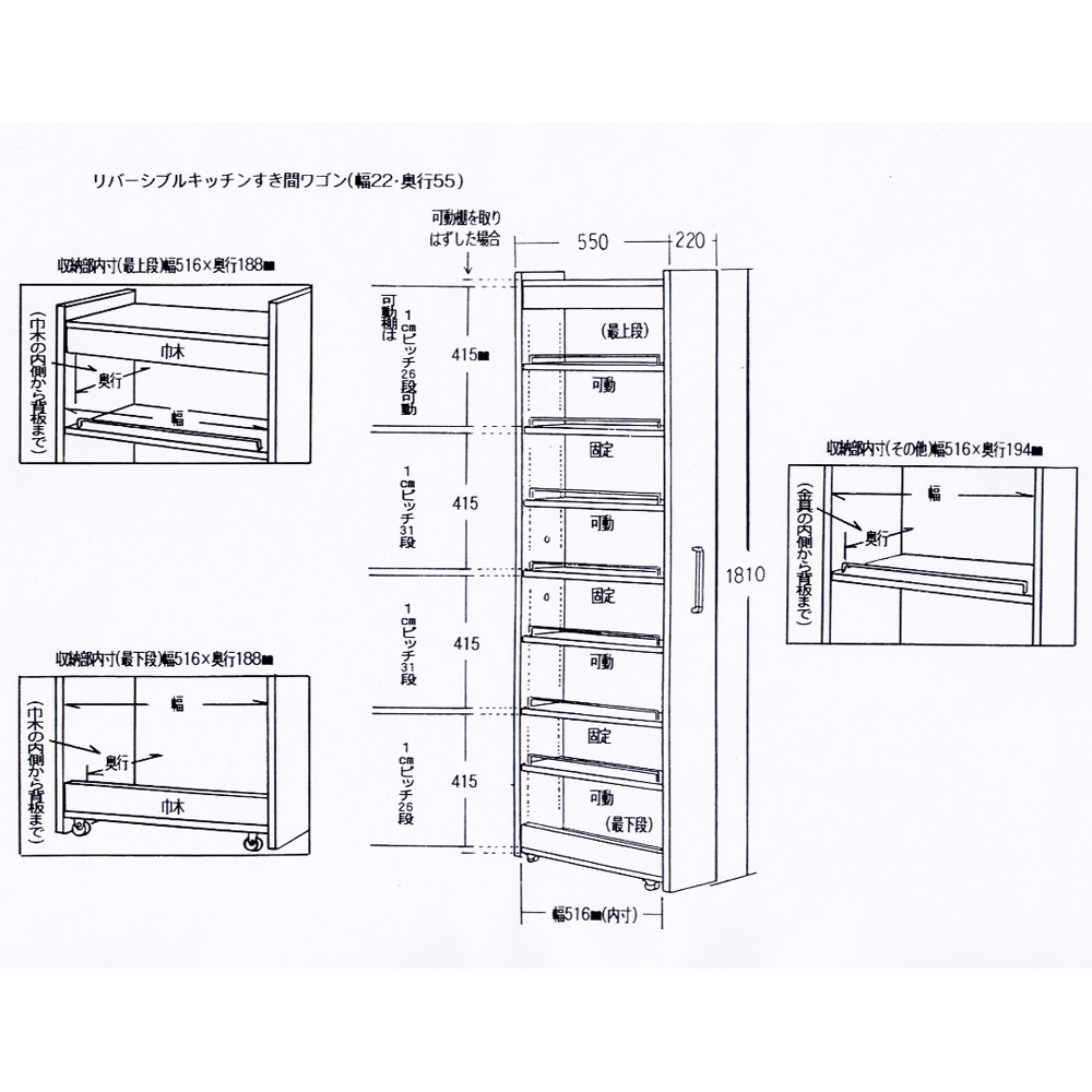 [幅22奥行55cm] リバーシブルキッチンすき間収納ワゴン 日本製 キッチンストッカー 隙間収納 キッチン収納 630044